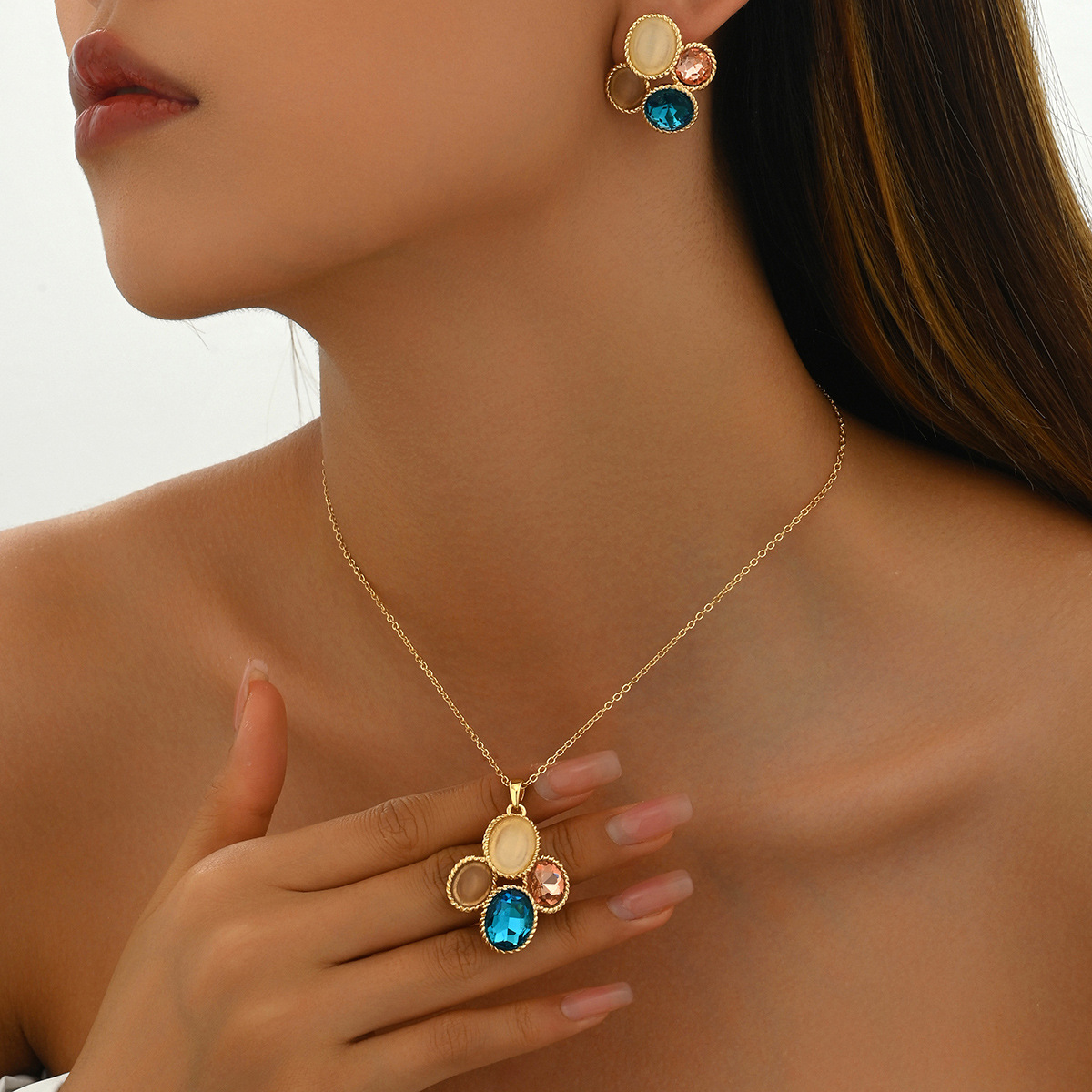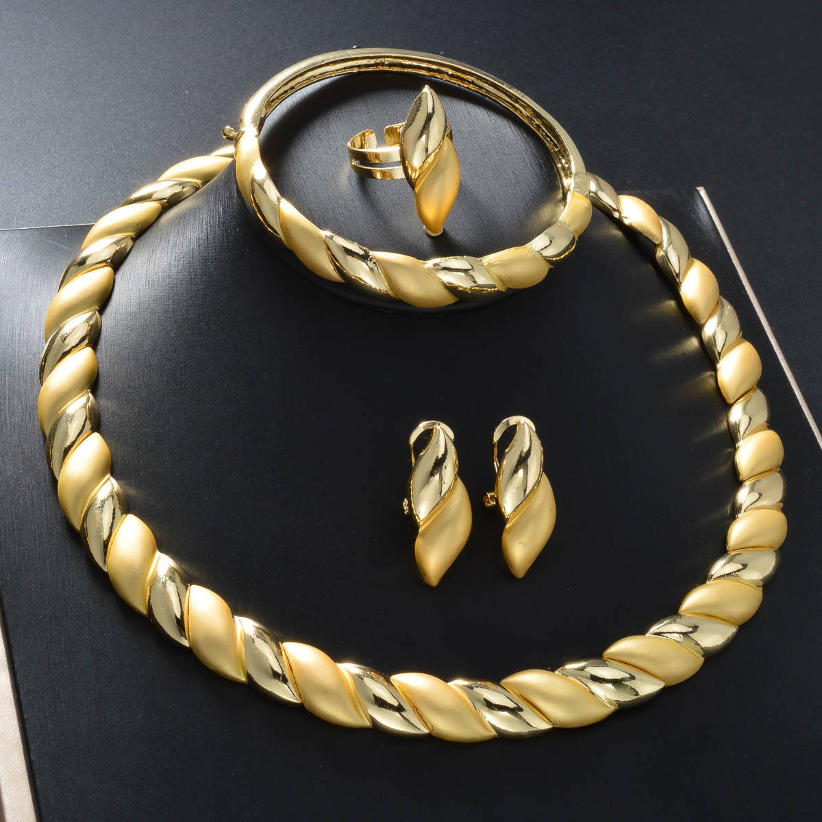 European and American Style Exaggerated Twist Color-Blocked Bracelet Necklace Earrings Ring 18K Gold-Plated Bridal Jewelry Set Dress