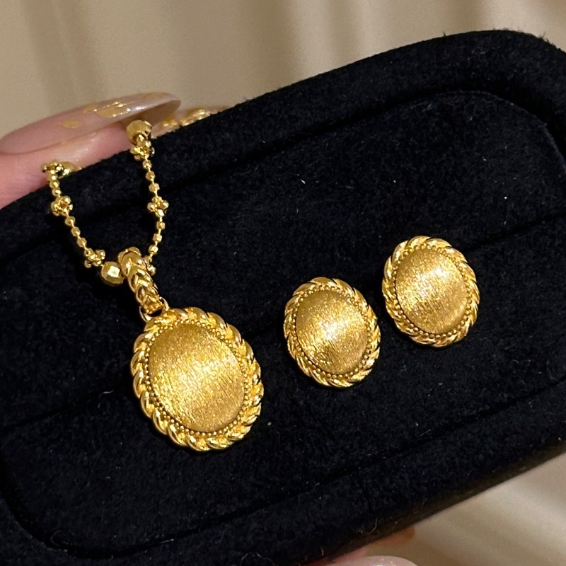 Vintage Retro High-End Hemp Lace Brushed Earrings Necklace Ancient Silk Oval High Color Retention Jewelry Set