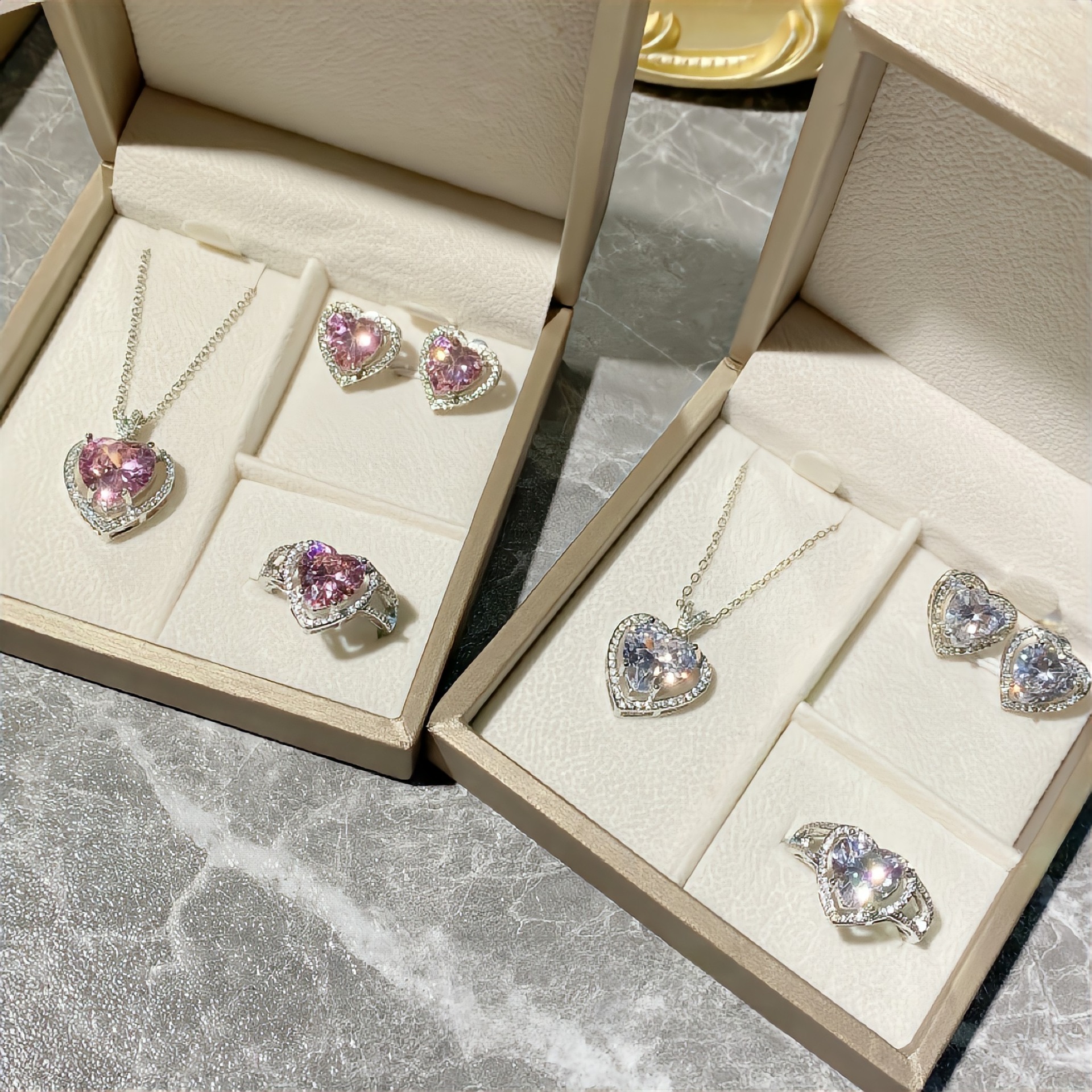 European and American color set pink heart zircon necklace earrings bracelets ring female four-piece live broadcast