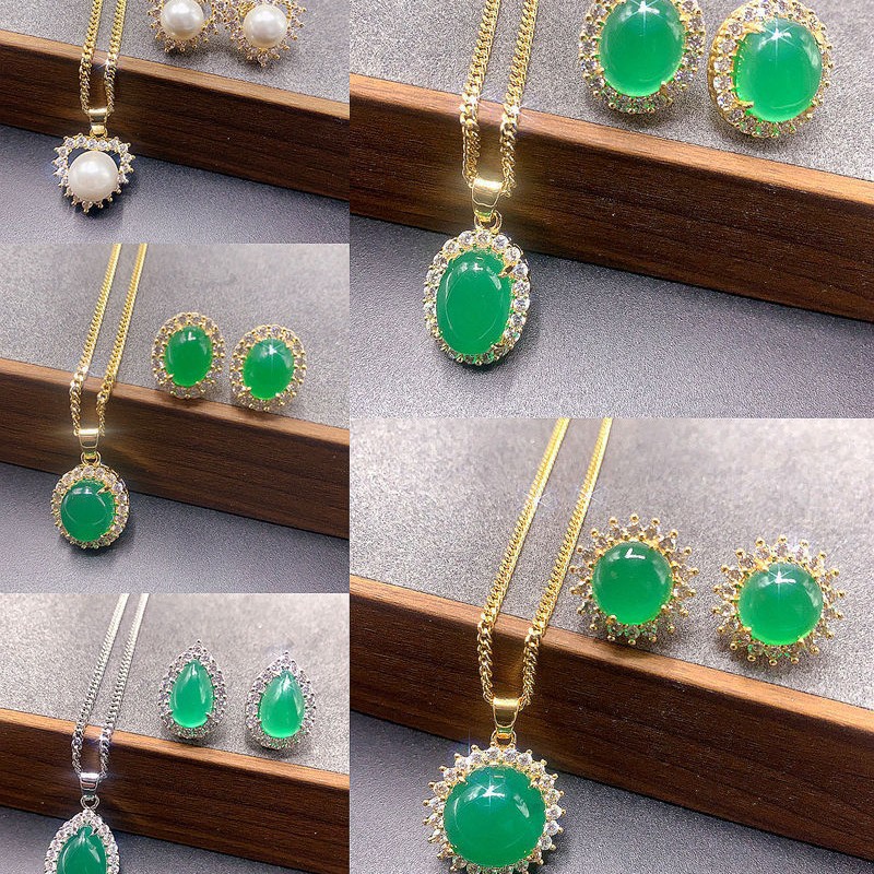 Natural Stone Chrysoprase Jade Three-Piece Set Retro Emerald Gemstone Necklace Earrings Set High-End Luxury Set