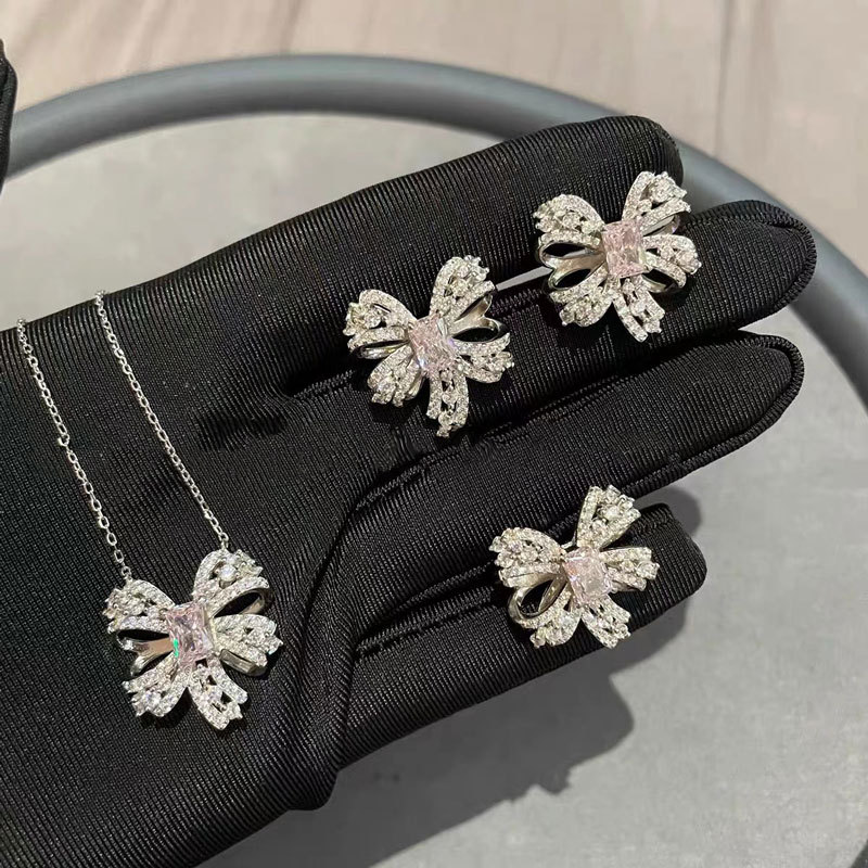 Full Diamond Powder Zircon Bow Ring Temperament All-match Earrings Necklace Women's Clavicle Chain New Jewelry Three-piece Set