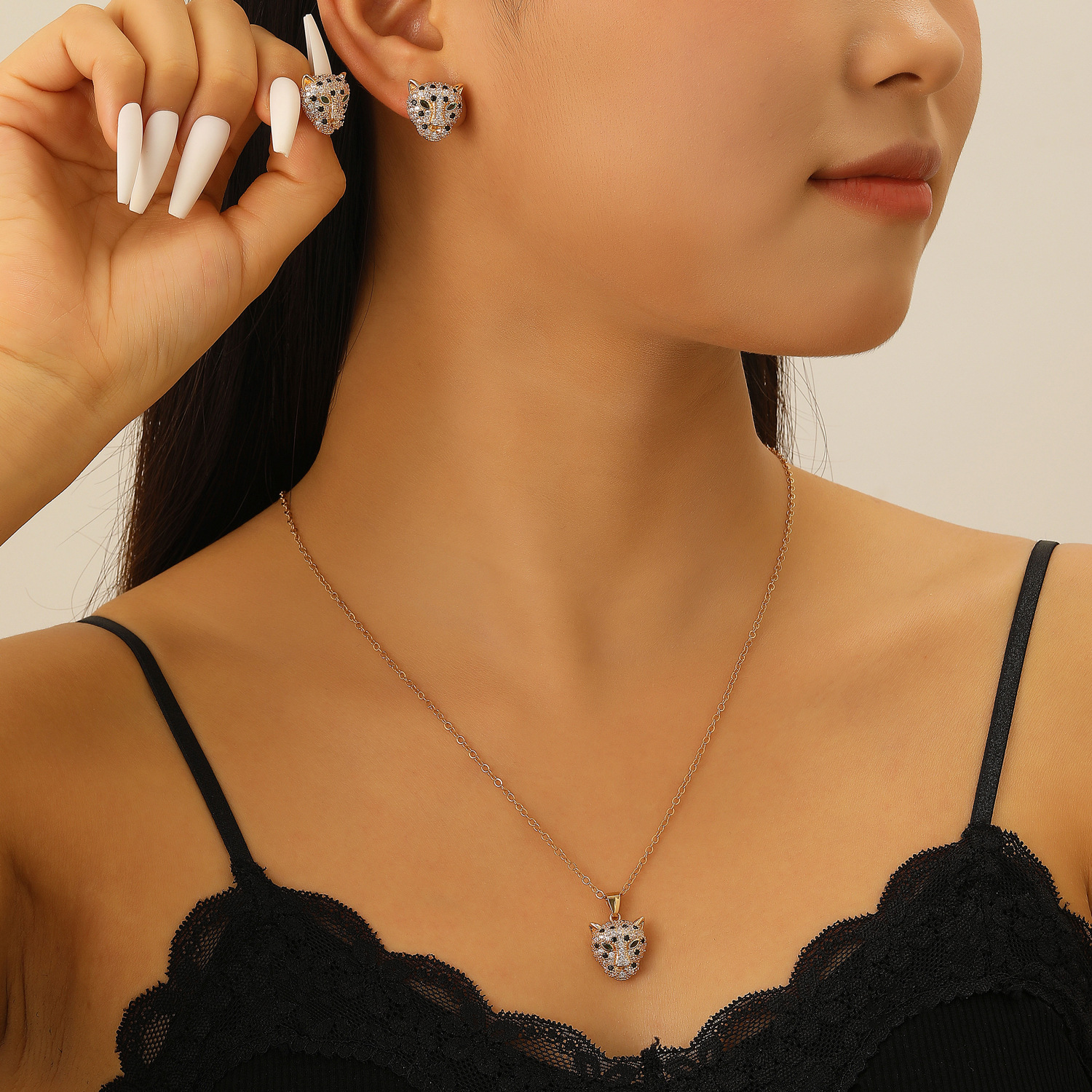 European and American Cross-Border Hip-Hop Leopard Head Earrings Necklace Set Copper Inlaid Zircon Fashion Light Luxury Animal Jewelry Accessories for Women