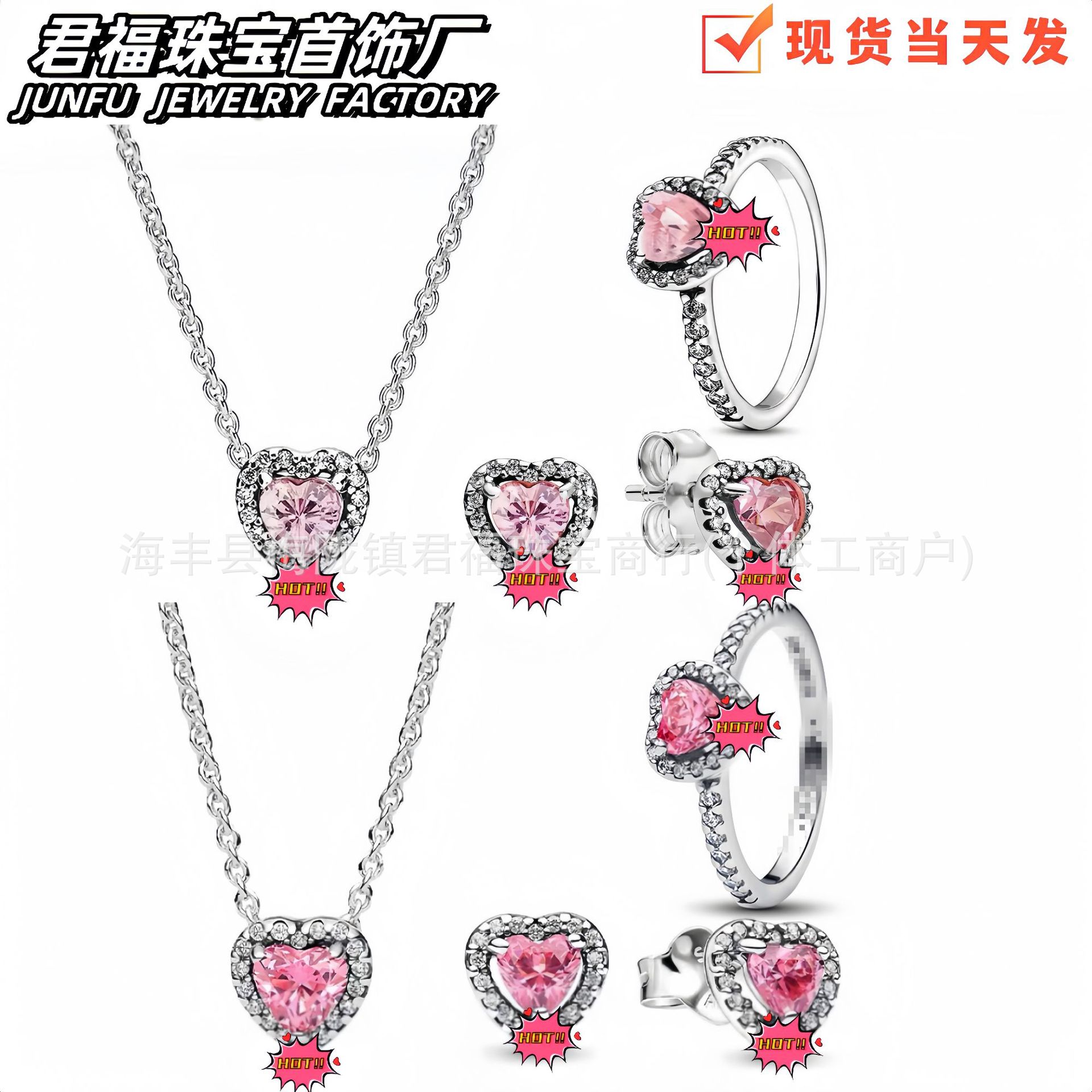 Pan Heart-Shaped Necklace Ring Earrings Jewelry Pink Set Women's Love Clavicle Chain Earrings Cross-Border Live Broadcast Silver Plated