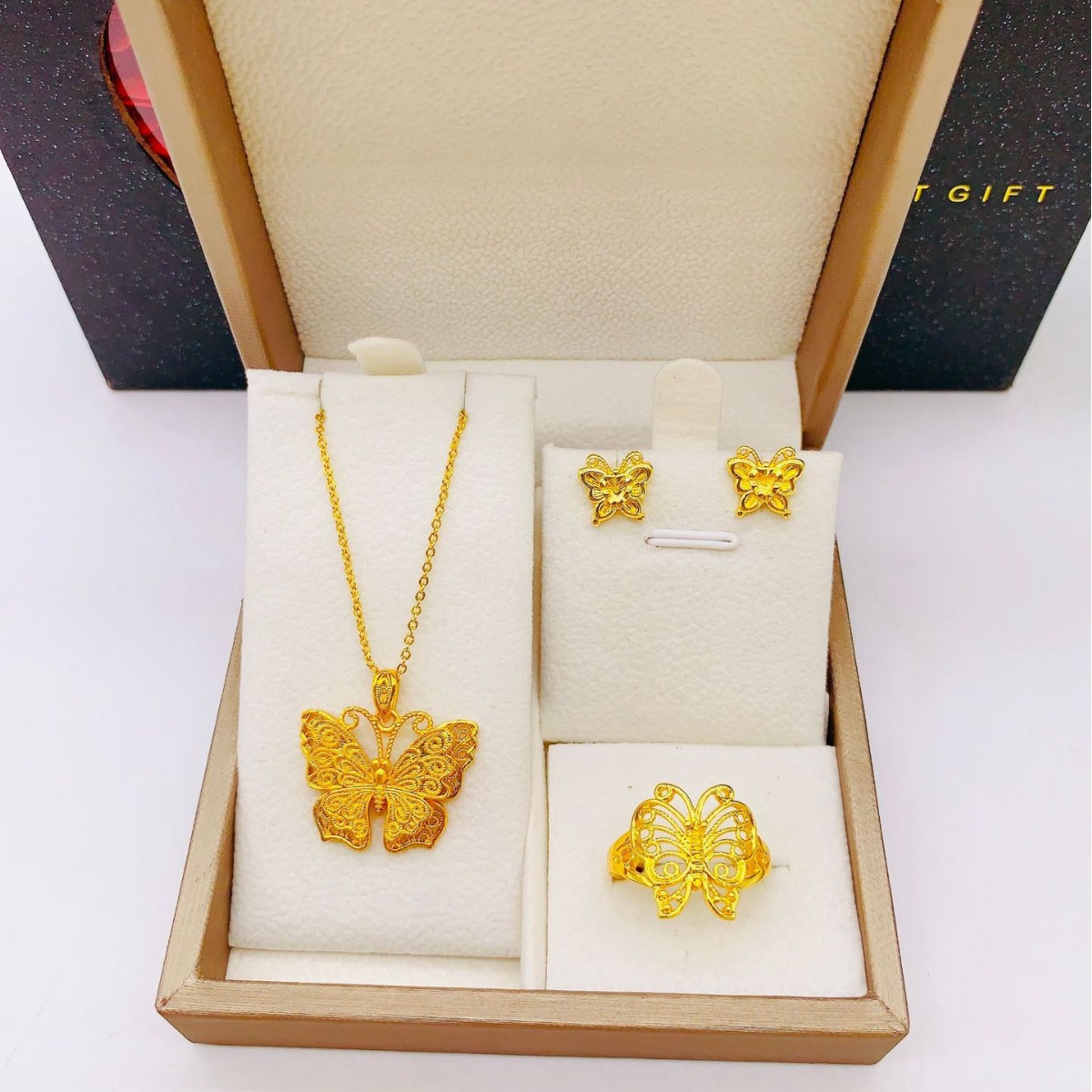 Brass Gold-Plated New National Trend Hollow Filigree Butterfly Pendant Fashion High-End Ring Set Manufacturer Wholesale
