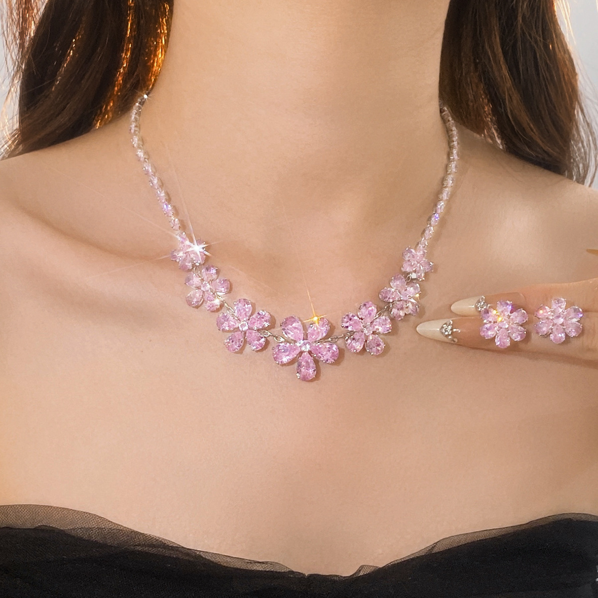 Zircon Flower Earrings and Necklace Two-Piece Set, Light Luxury Style, Clavicle Chain, Cross-Border Jewelry for Women, Wholesale Hot-Selling Light Luxury Style