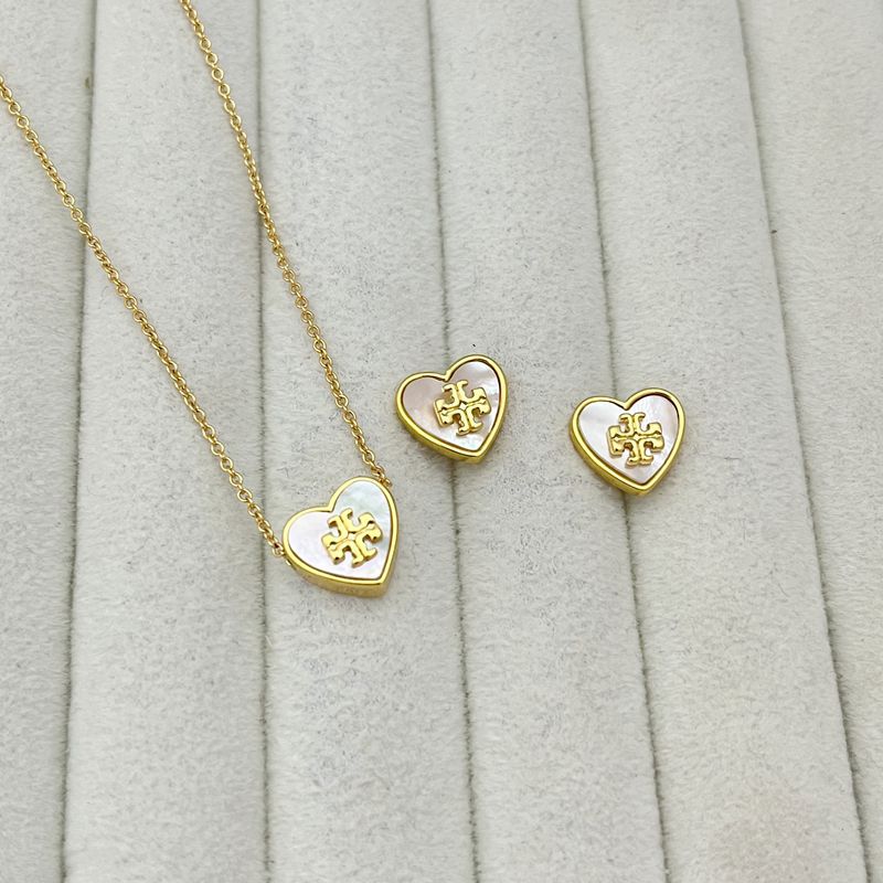 European and American Fashion Accessible Luxury Natural Shell Inlaid Copper Plated 18K Gold Heart Earrings Necklace Jewelry Set