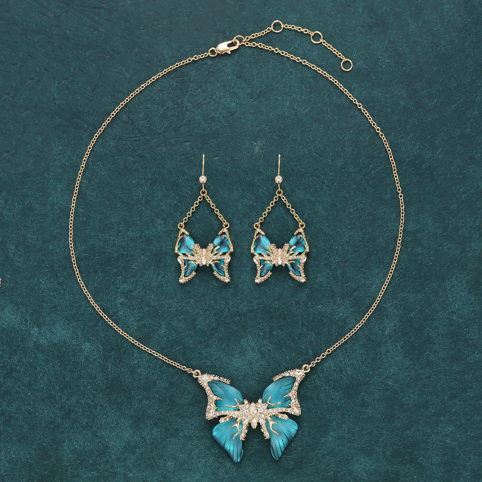 Medieval Style Vintage Inlaid Zirconium Green Gradient Enamel Butterfly Ear Hook Necklace Fashionable and Versatile Women's Jewelry Set