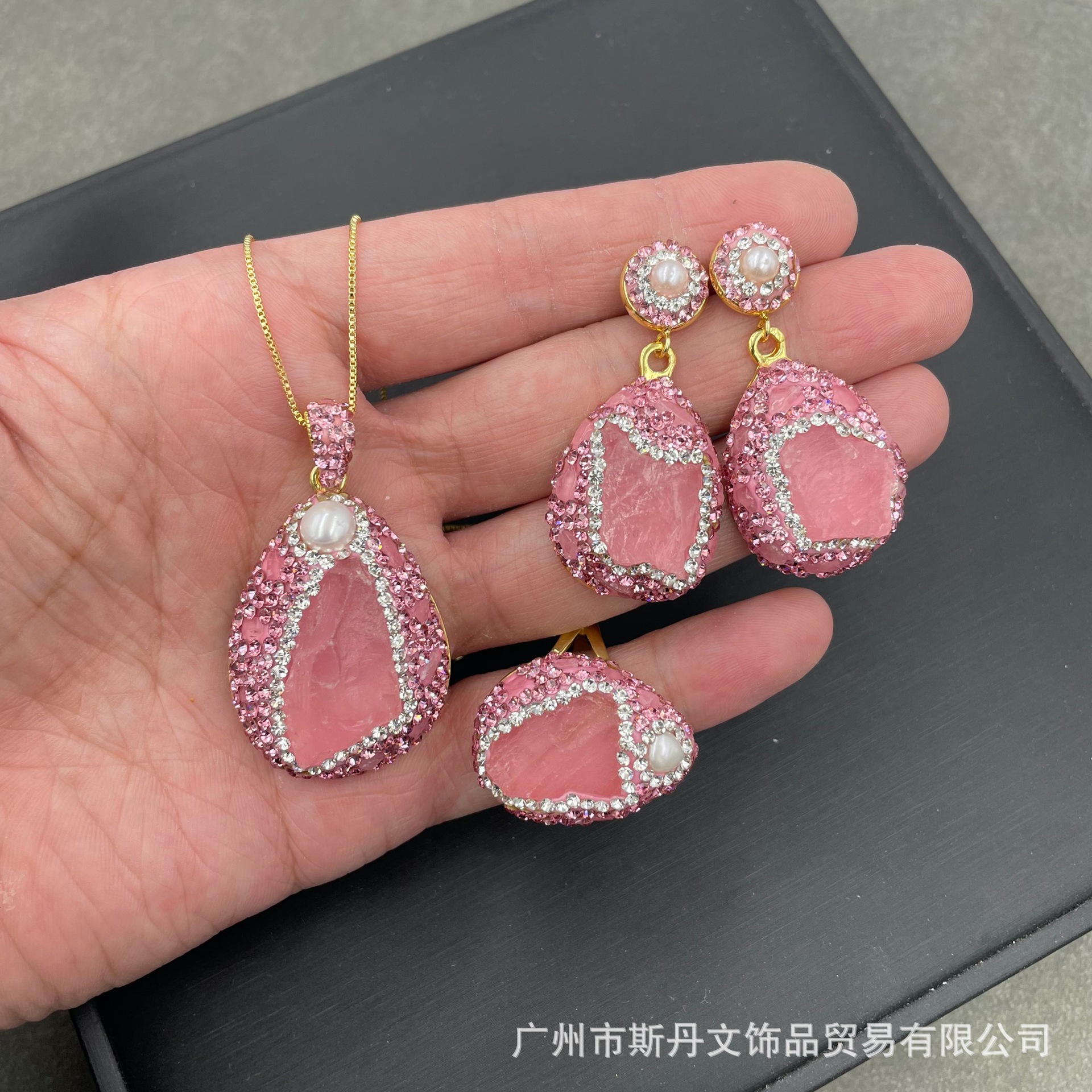 Natural Gem pink crystal Czech Diamond original stone suit European and American personality light luxury style factory wholesale supply three-piece set