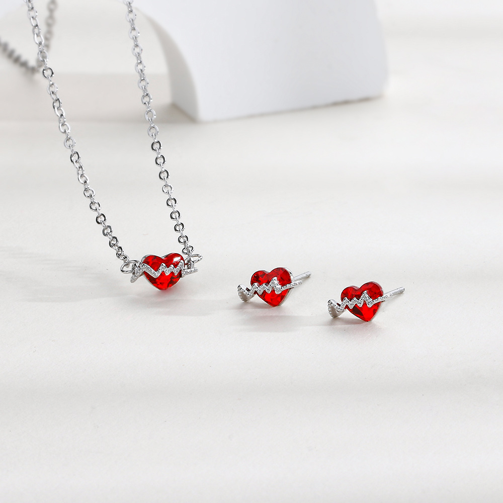 Red Heart Set Japanese and Korean Ins Style Heart-Shaped Necklace Exquisite Clavicle Chain Simple Small Sparkling Diamond Heartbeat Earrings