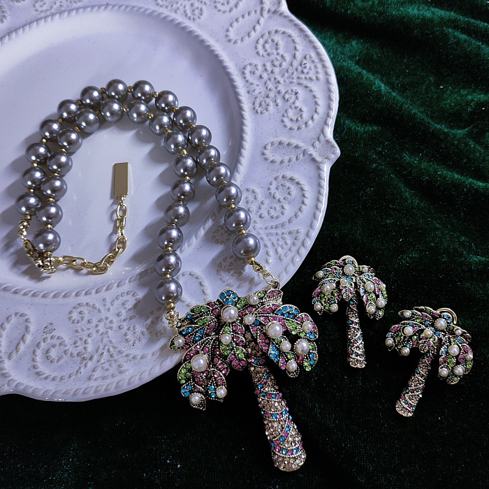 Colorful Diamond-Encrusted Coconut Tree Pearl Earrings Necklace Set Light Luxury High-End Clavicle Chain Retro Palace Style Jewelry