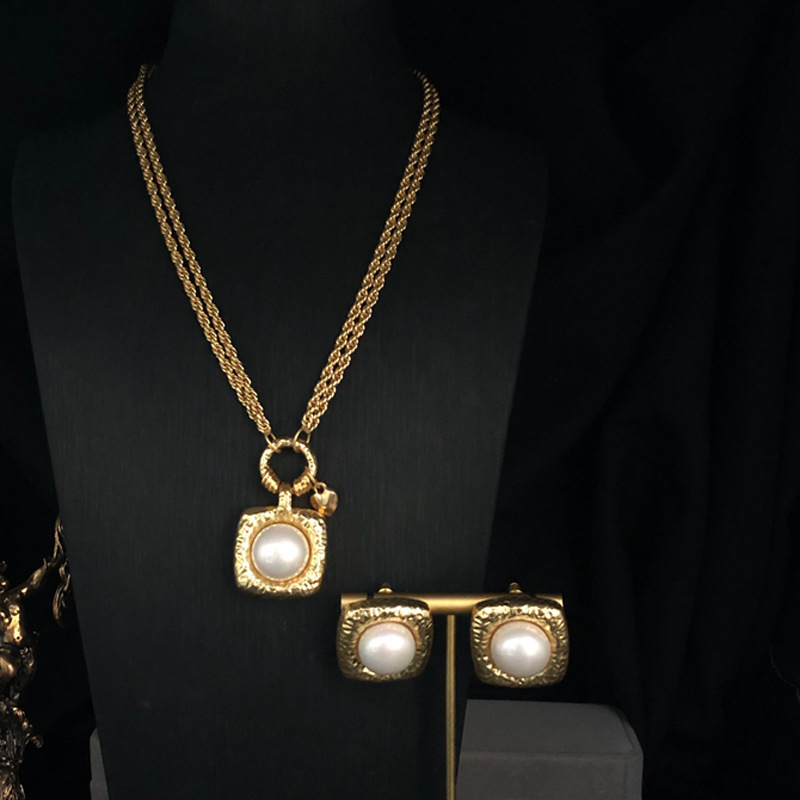 Elegant Fashion Jewelry Multi-layer Copper Chain Mabei Pearl Inlaid Necklace Earrings suit Antique Jewelry