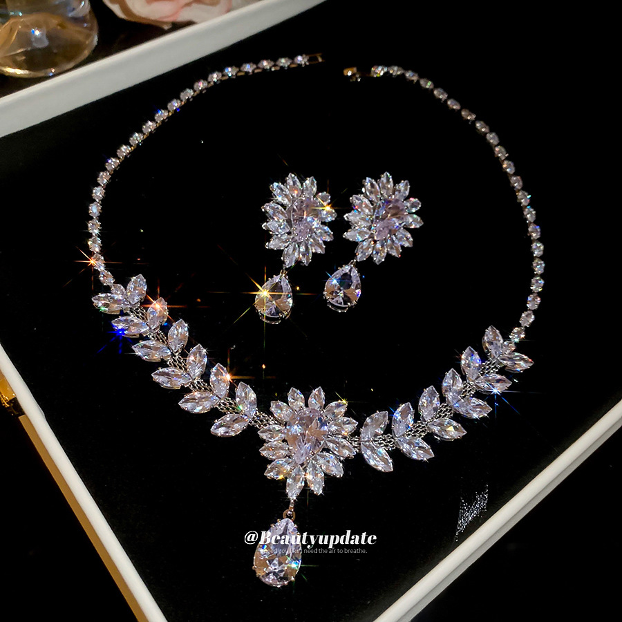 AliExpress cross-border popular Korean style 3A water drop pendant zircon necklace earrings simple casual bridal jewelry suit