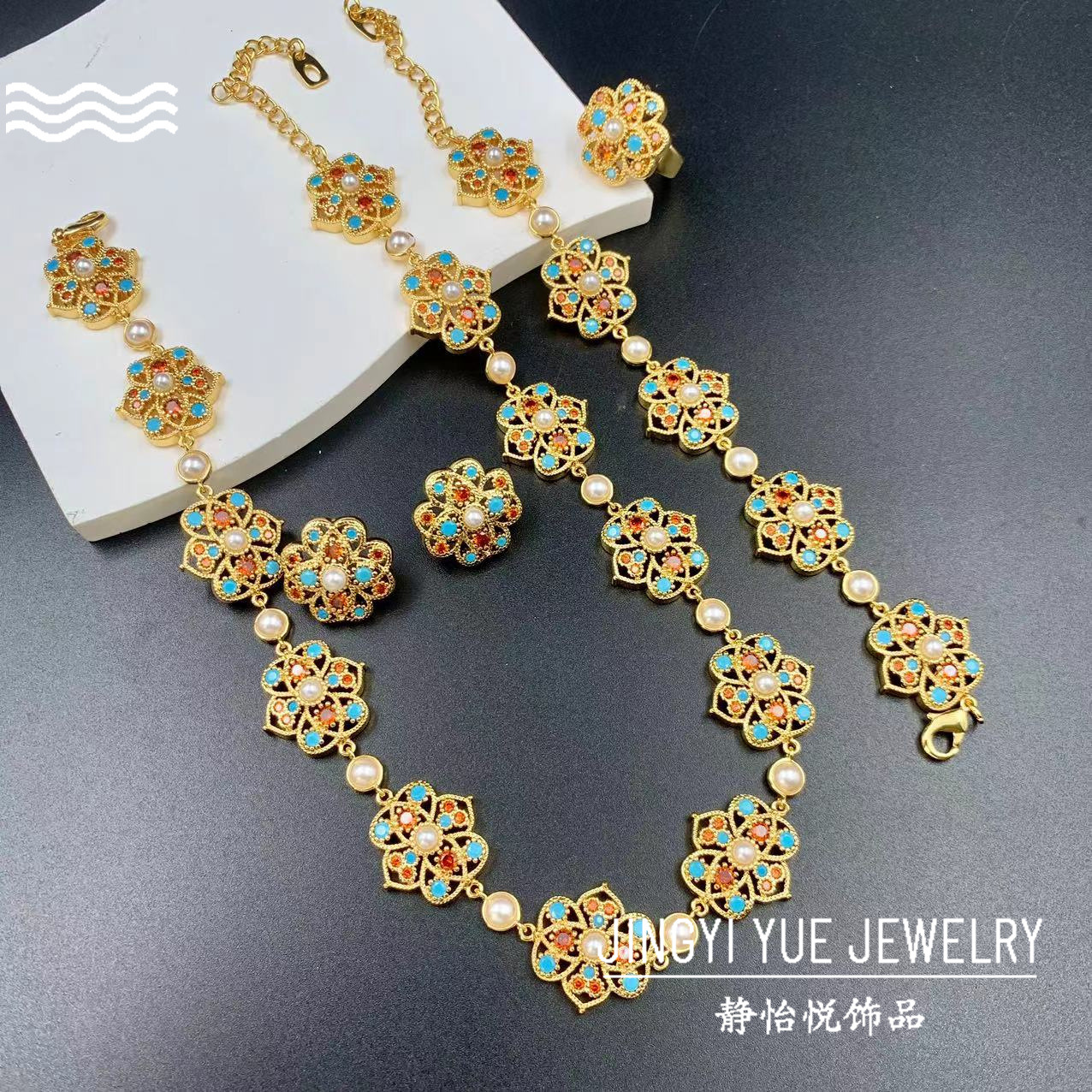 Middle Ancient Niche Irregular Flower Jewelry suit Light Luxury Brass Inlay Bracelet Necklace Earrings Ring suit