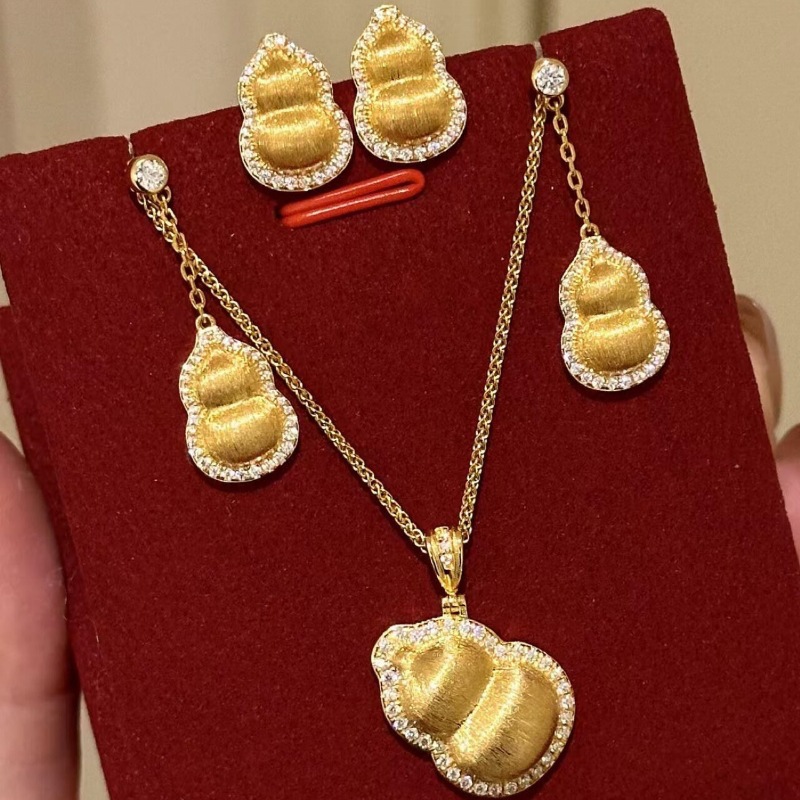 Light Luxury Retro Brushed Diamond-Encrusted Gourd Necklace, Ring, Bracelet, Earrings, New Chinese Style Stacking High-End Set