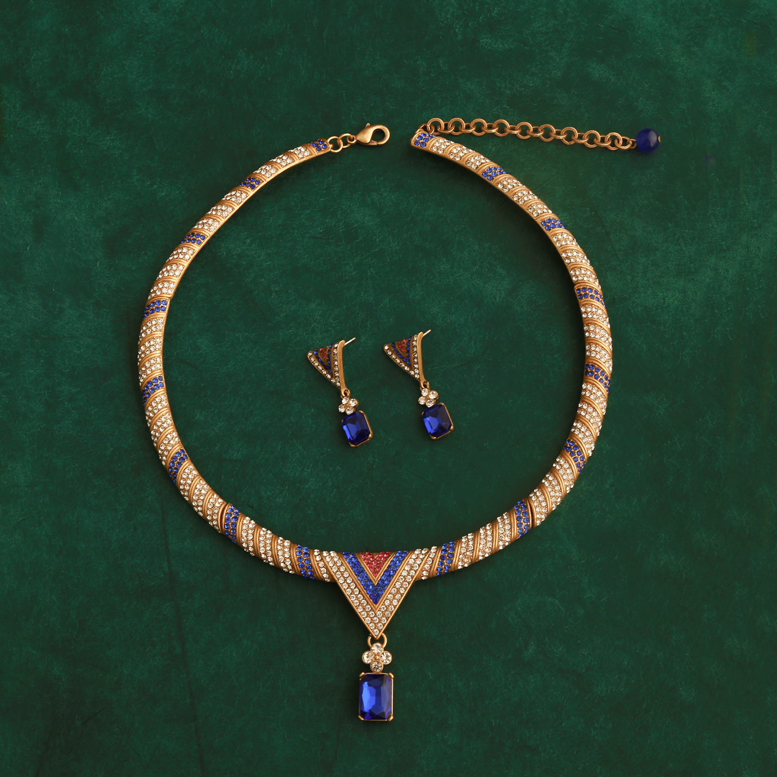 Blue Crystal Pendant Triangular Earrings Retro Heavy Industry Exaggerated Women's Necklace Clavicle Chain Sweater Chain Jewelry Set