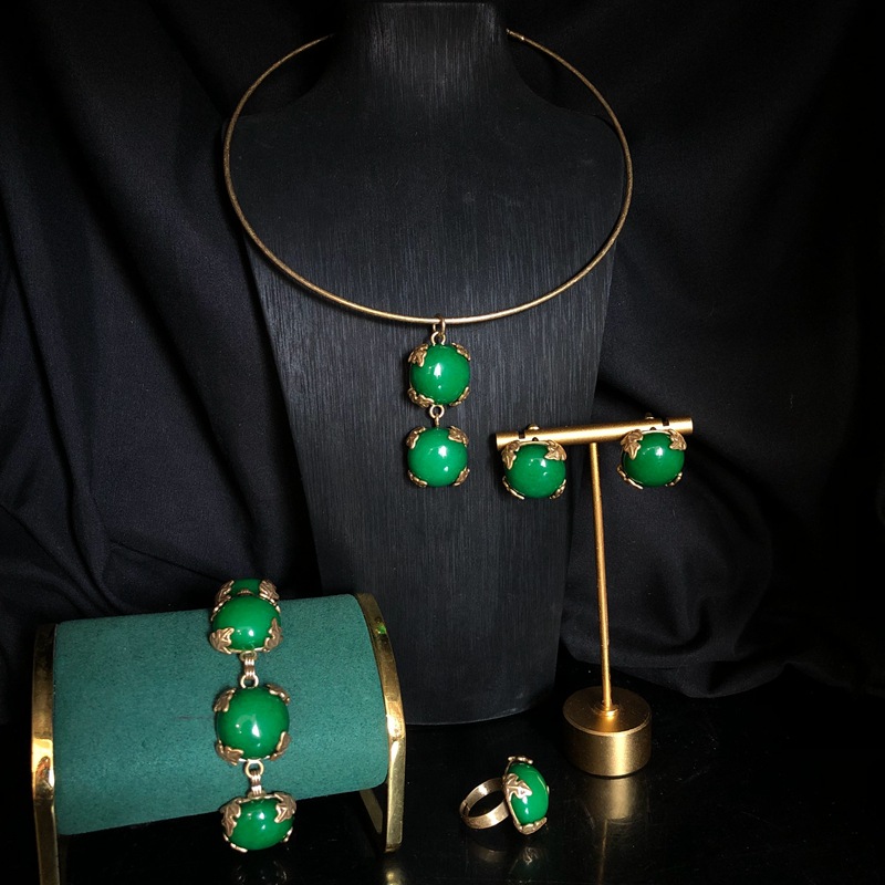 Vintage Palace Style Jewelry Women's Trendy Green Agate suit Copper Material Collar Bracelet Ring Ear Stud Elegant All-match