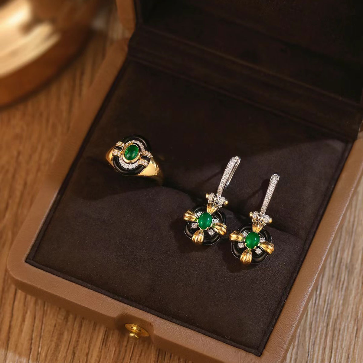 Vintage French Retro Unique Black Agate Glue Ring Gold Diamond Round Emerald Earring Set
