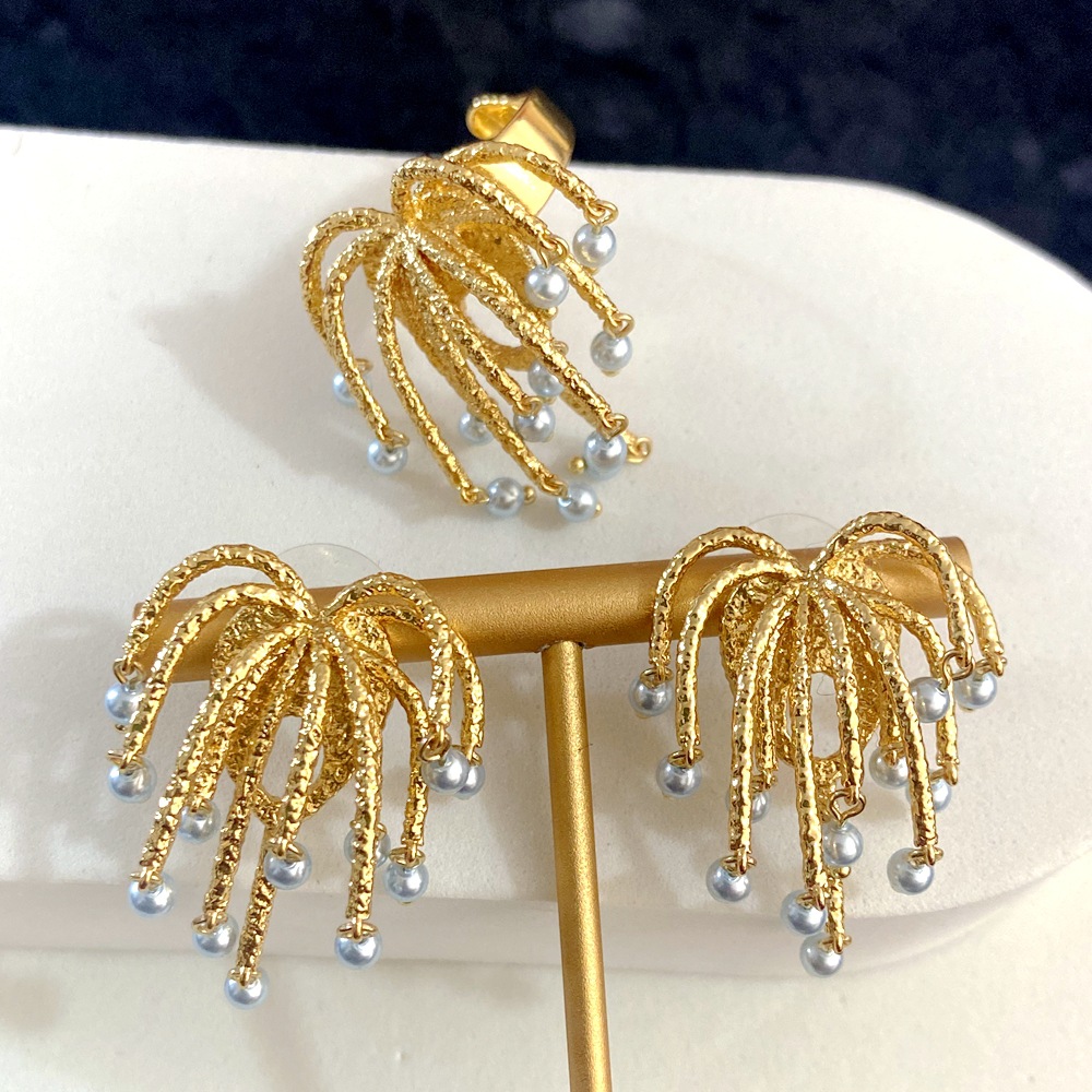 New Vintage Water Flower Fire Pearl Copper Ring Electroplated Real Gold Imitation Pearl Tassel Earrings Middle Ancient Light Luxury suit