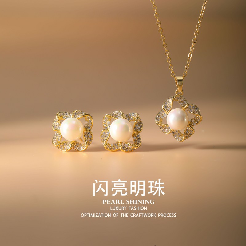 Shiny Pearl Copper Earrings Necklace Set Flower Non-Fading Women's Light Luxury High-End Cross-Border Wholesale Jewelry