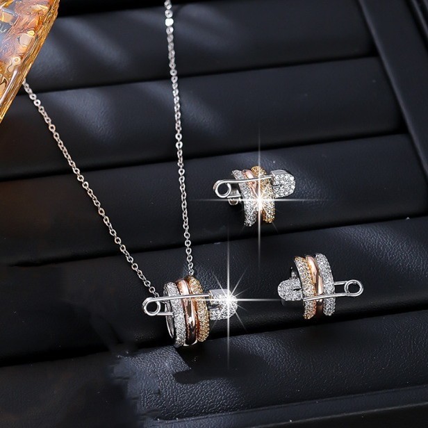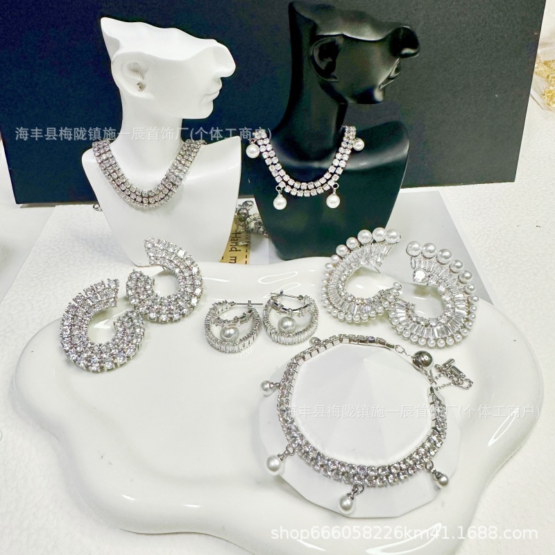 Trendy High-End Style Full Diamond Stud Earrings for Women, New Geometric Pin Necklace, Bracelet, Ring, and Pendant Set