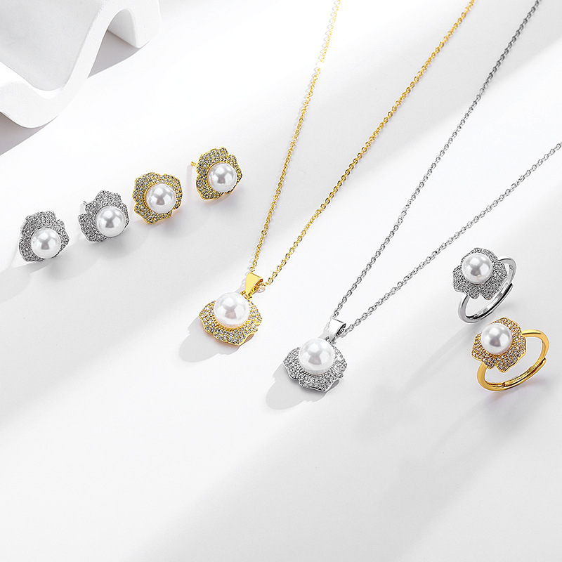 European and American Design Flower Pearl Set S925 Silver Needle Earrings Ring Pendant Empty Holder Noble and Elegant Adjustable Ring