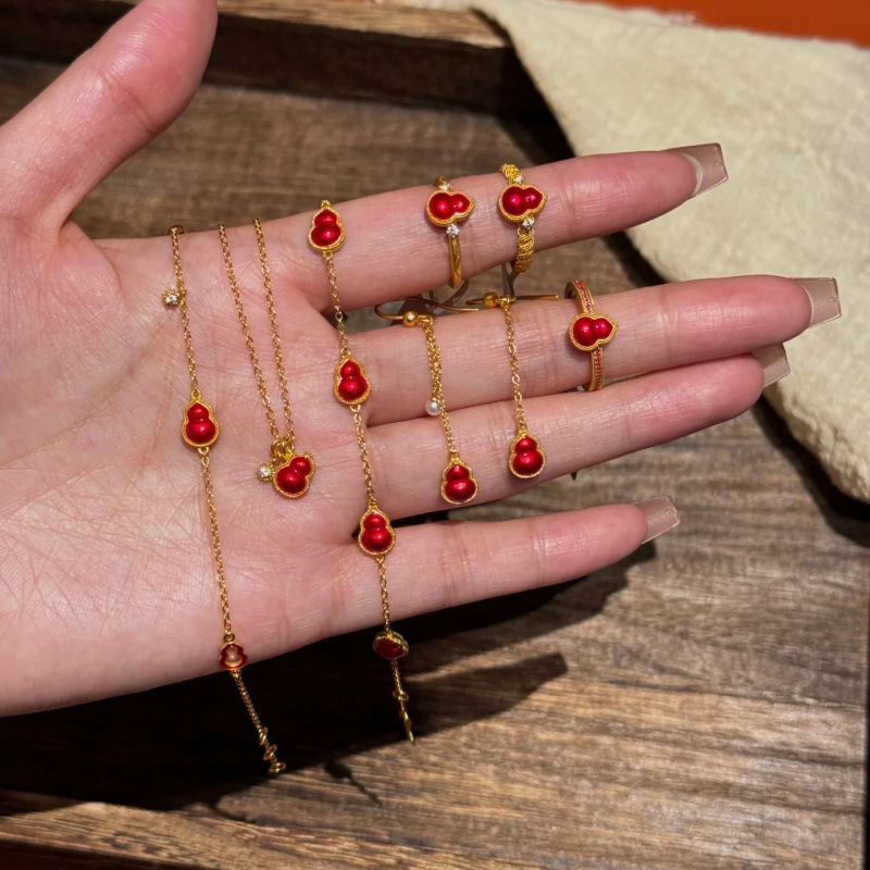New Chinese Style Filigree Red Gourd Drip Glaze Necklace Ring Earrings Bracelet Temperament Versatile Lucky Red Jewelry Set