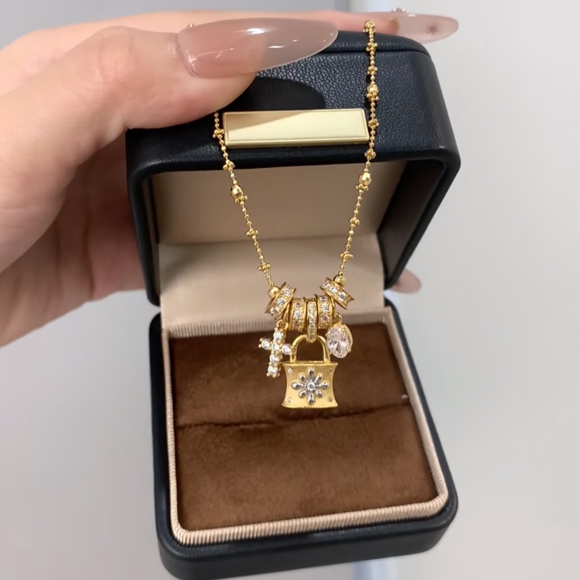 Gold French Cross Lock Oval Gemstone Pendant Necklace 2025 New Hot Style Accessible Luxury Fashion High-End