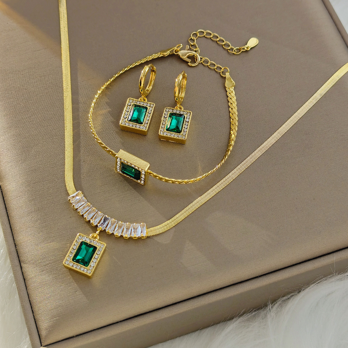 French Entry Luxury vintage Court Style Elegant Jewelry suit Retro Emerald Zircon Necklace Bracelet Ear Buckle