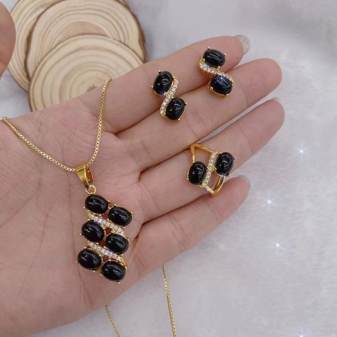 Xinjiang Jewelry Crystal Necklace Three-piece Set Micro-inlay Handmade Electroplated Black Onyx Earrings Set Personality Fashion Ring