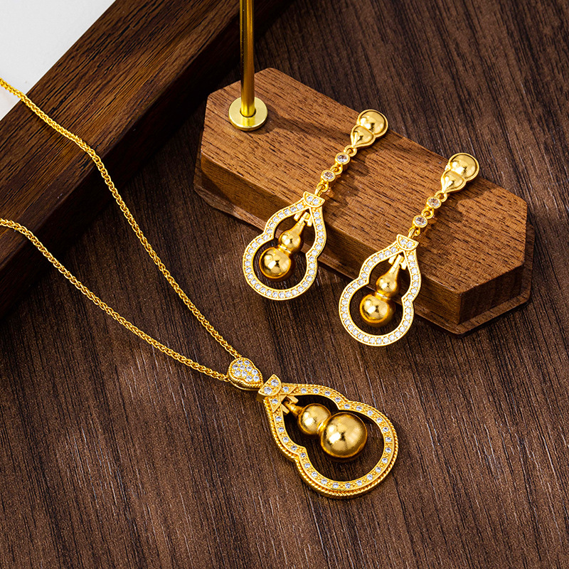 New Chinese-Style Diamond-Encrusted Brushed Gourd Pendant Necklace for Women, Chinese-Style Vietnamese Sand Gold Earring Set, Long-Lasting Jewelry