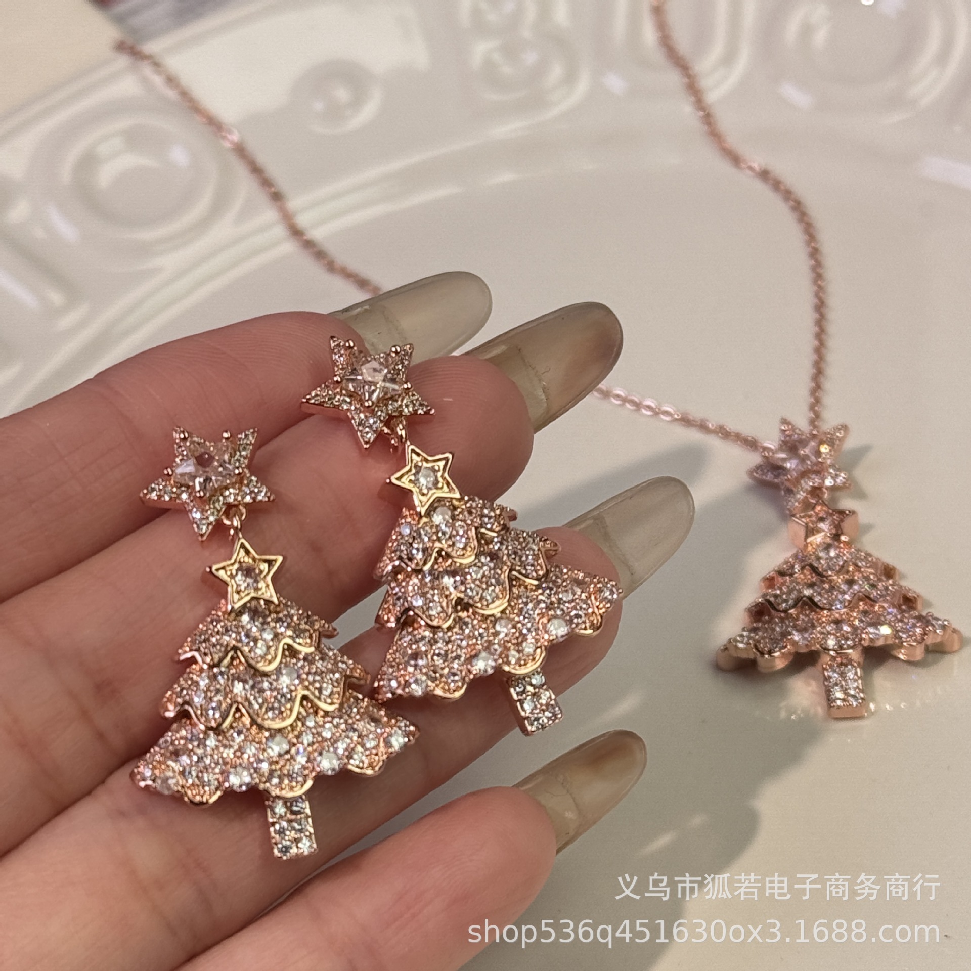 Yiwu Factory's Popular New Christmas Product Pink Christmas Tree Five-Pointed Star Full Diamond Earrings for Women Are Sweet, Gentle and High-End