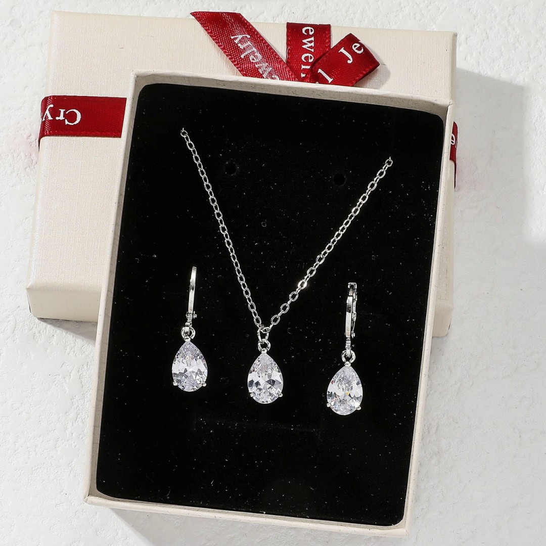 Brilliant Copper Set with Zircon Water Drops Gold Silver Necklace Earrings Bride Wedding Jewelry Gift Box Necklace Earrings