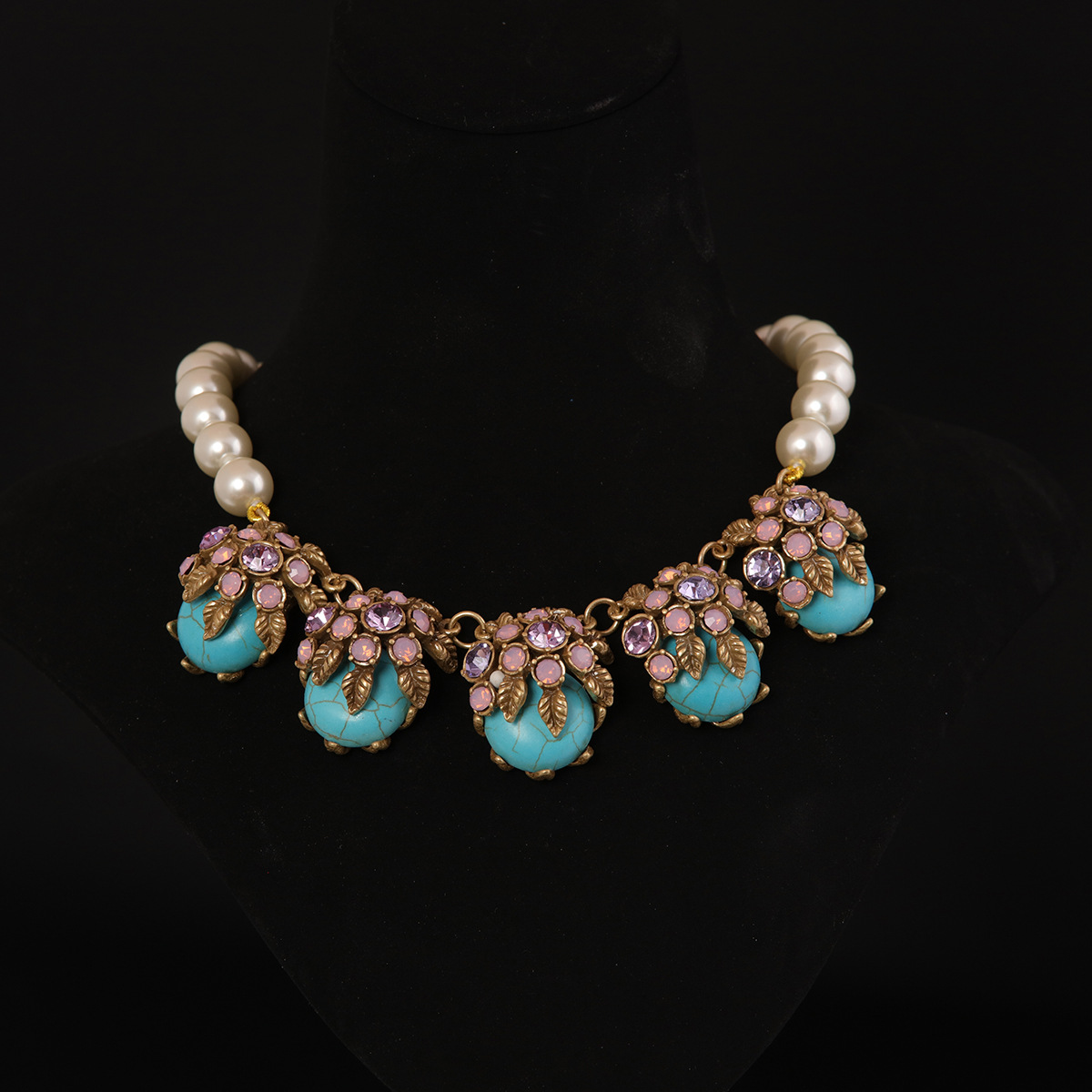 Middle Ancient vintage High-grade European and American Style Temperament Copper Plated Copper Alloy Blue Pine Flower Ball Necklace Earrings suit