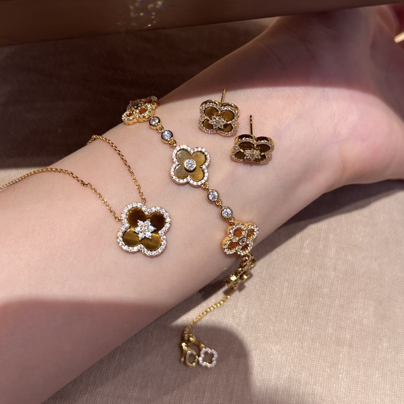 Diamond-Studded Tiger Eye Stone Four-Leaf Flower Earrings, Lucky Grass Pull-Out Bracelet, High-End New Chinese Style Accessible Luxury Necklace