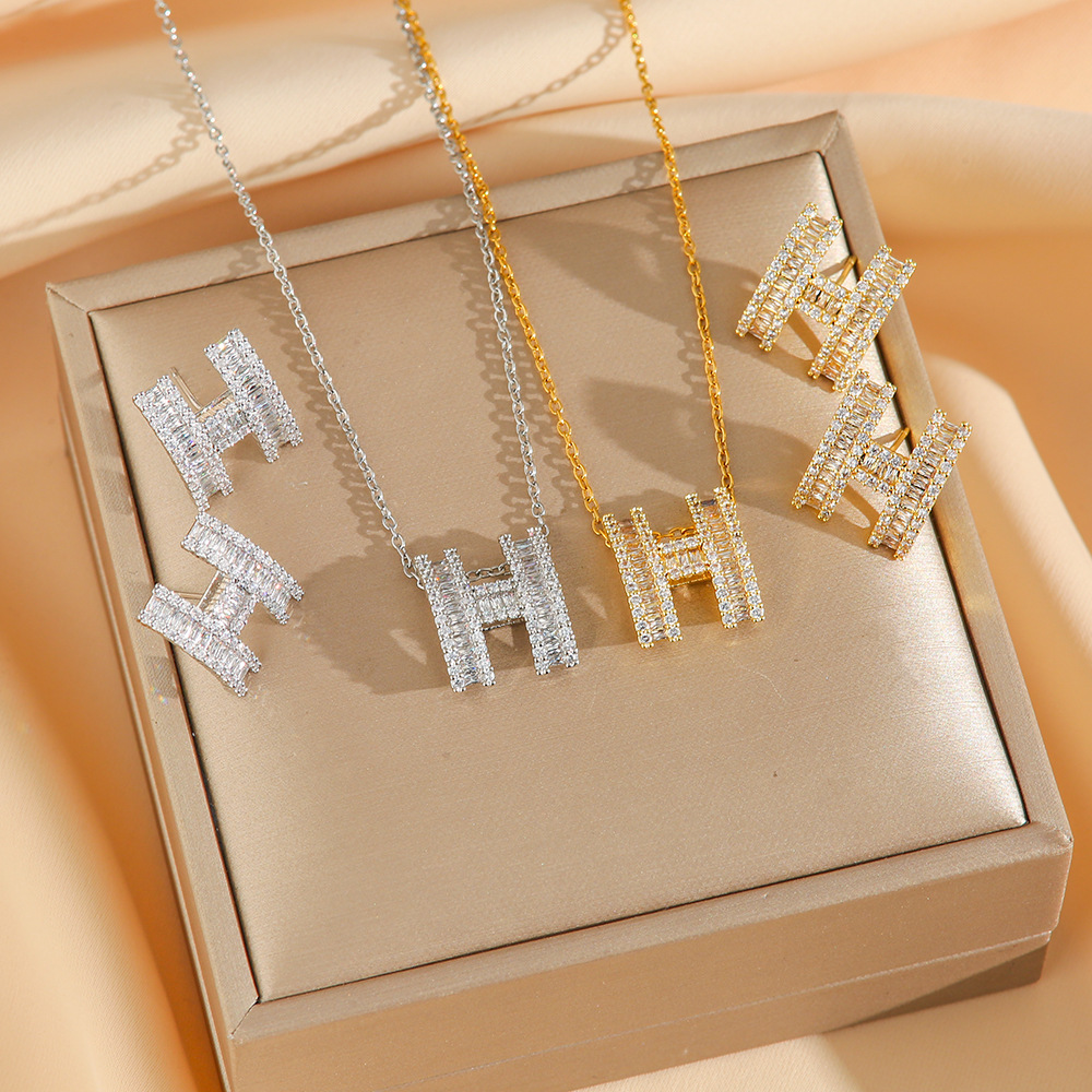 Real Gold Electroplated Silver Needle Zircon Letter H Earrings Design Feeling Temperament Diamond Ear Studs Advanced Light Luxury Titanium Steel Necklace