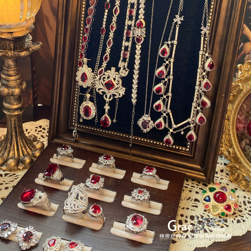 Grace bright pomegranate ruby ring jewelry micro-inlaid pigeon red necklace mid-ancient style elegant stud earrings bracelet