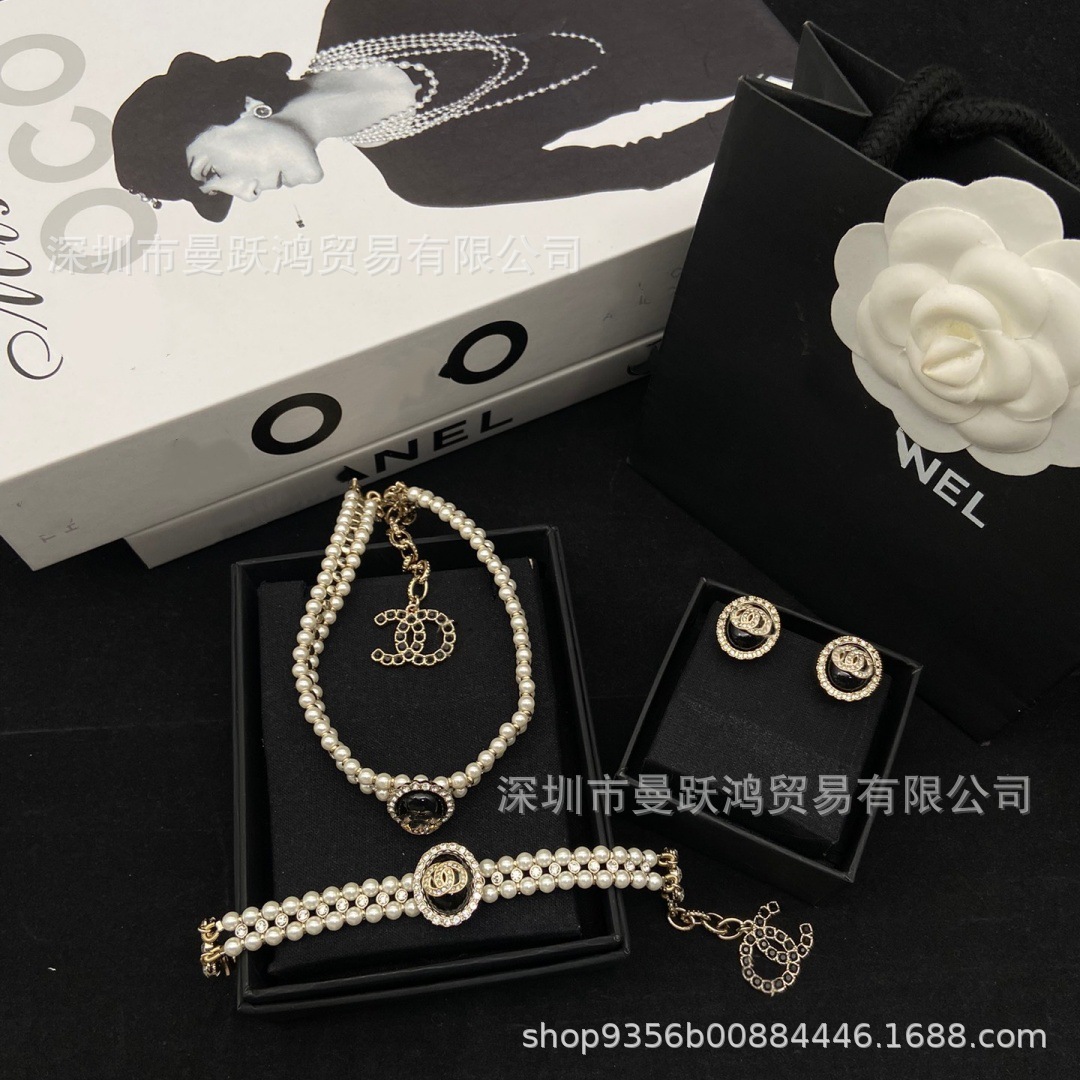 High-Quality Double C Double-Layer Celebrity Pearl Necklace with Label, Women's Diamond-Studded European and American Bracelet, Women's Earrings