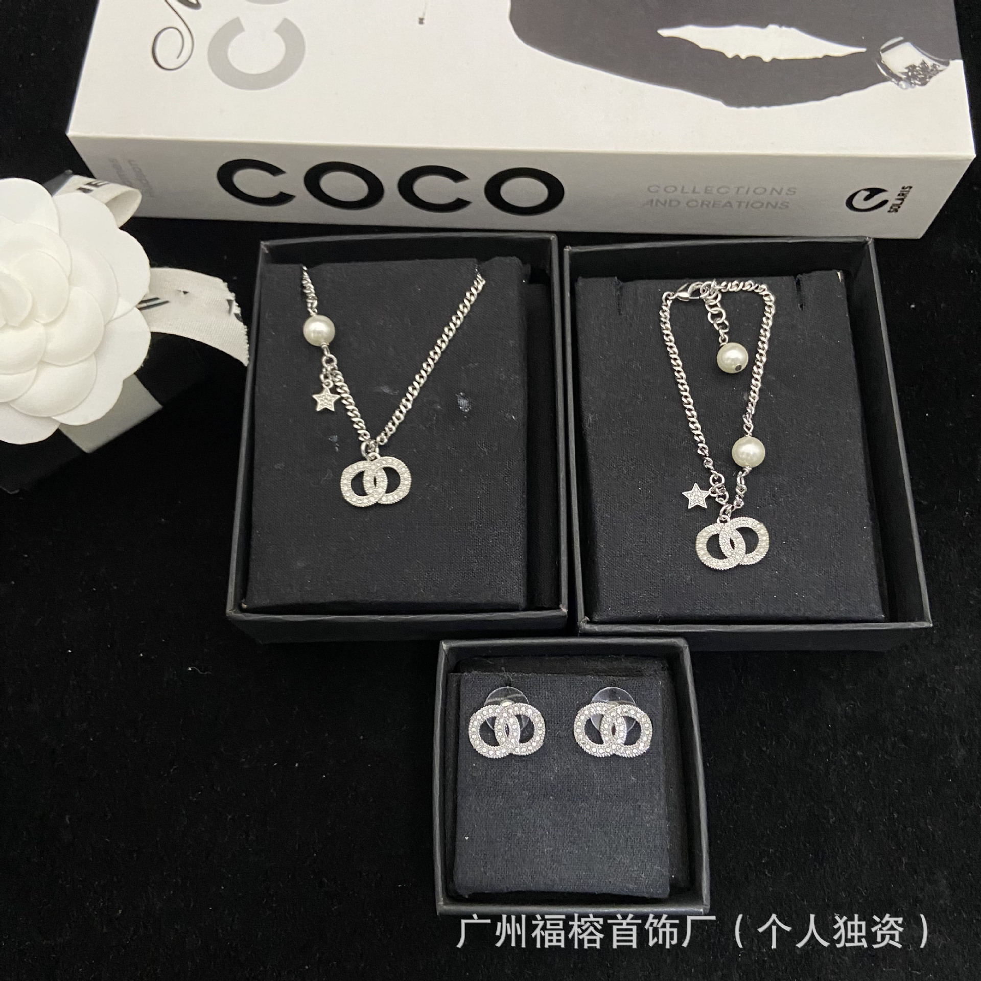 Xiangjia Five-Pointed Star Pearl Studded with Diamonds Double C Letter Necklace Female Star Bracelet Set Earrings Set Celebrity Clavicle Chain