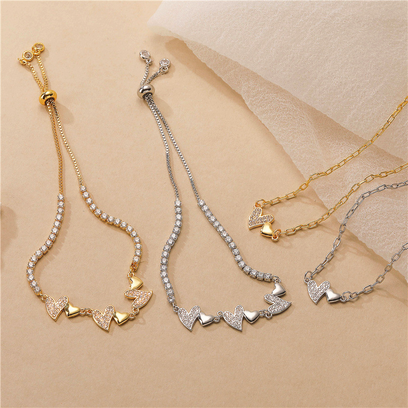 HECHENG jewelry elegant copper plated 18K gold double heart-shaped drawable adjustable bracelet sweet glossy heart-shaped necklace