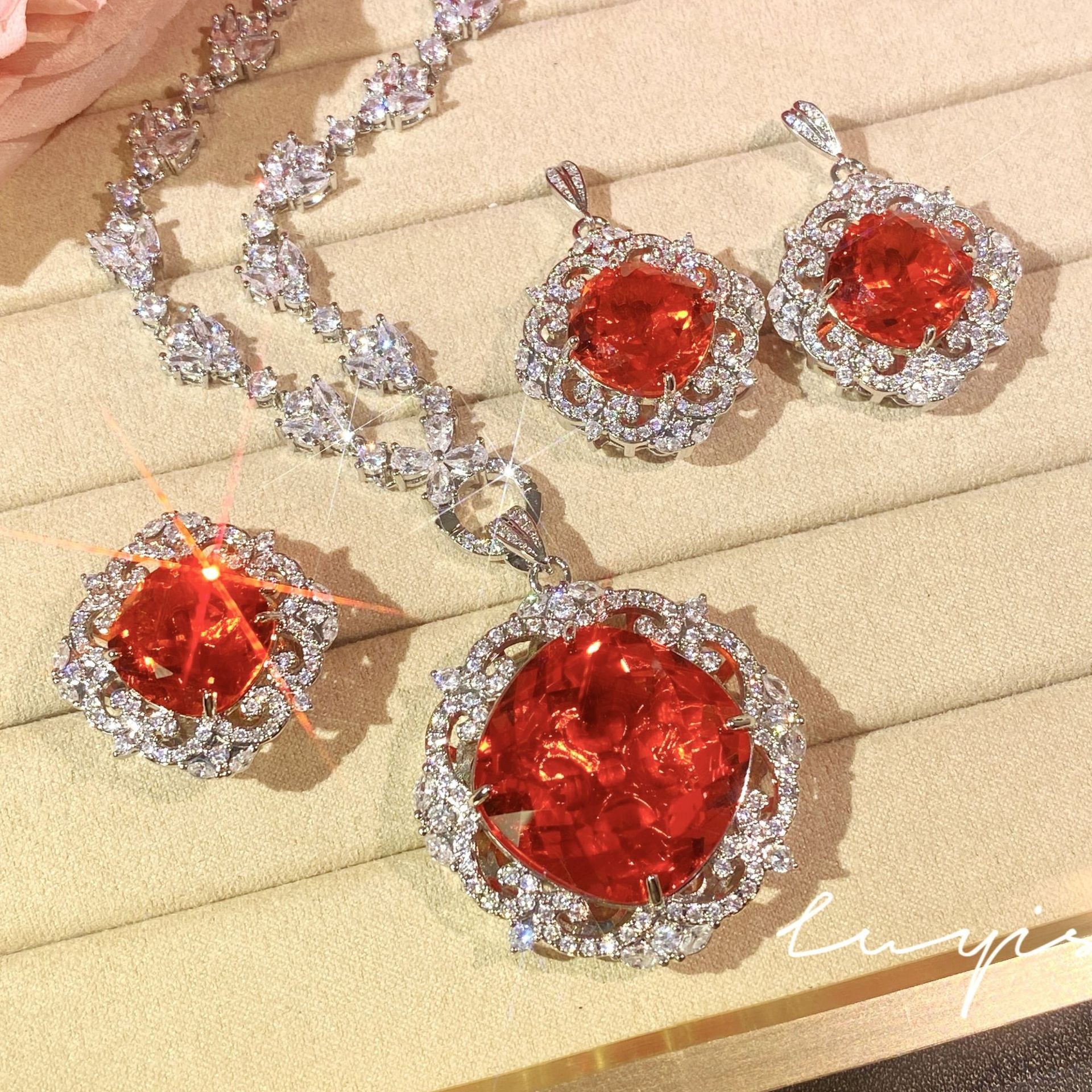 S925 Silver Needle suit Earrings Necklace Ring Copper Jewelry Pigeon Blood Corundum Retro Exquisite High-end Luxury Women's Style