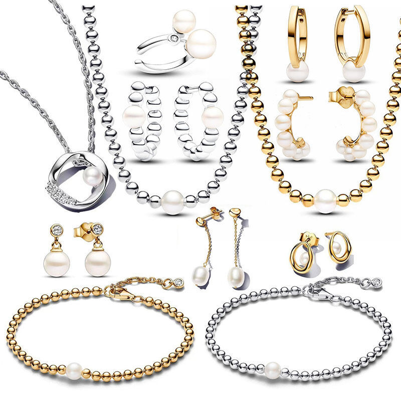 Pandora White Copper Plated 925 silver Pearl Necklace Golden Earrings Irregular Female DIY Couple Clavicle Chain