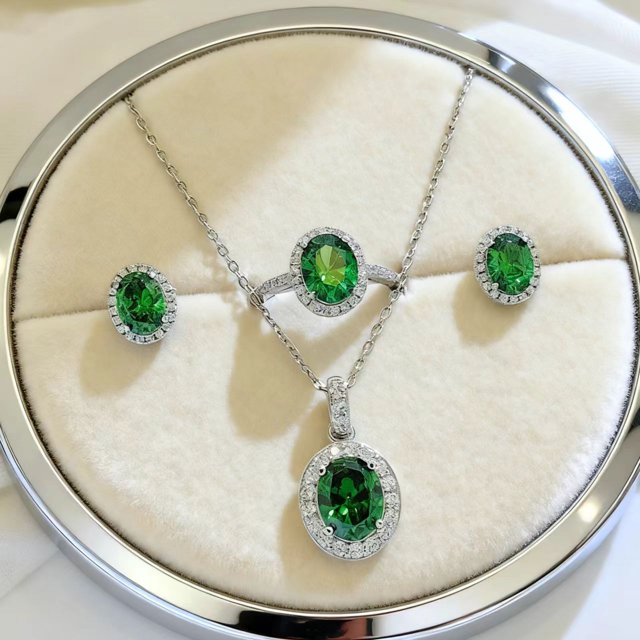 Tiktok Influencer Live Popular Emerald Necklace Dinner Party Coconut Round Gemstone Pendant Earrings Ring Jewelry Set