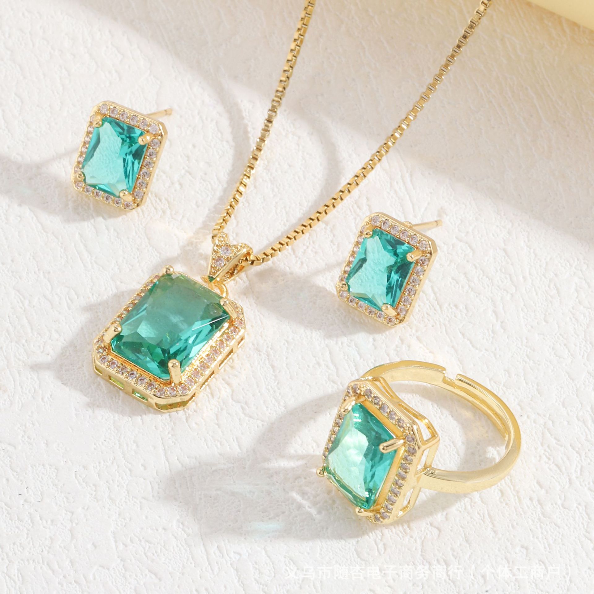 Emerald Square Gemstone Earrings Ring Necklace Women's Set Cross-border Explosive Fashion Retro Light Luxury Elegant Jewelry