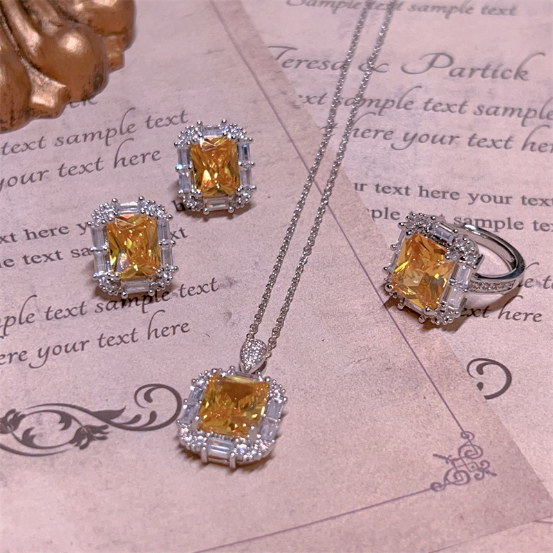 European and American light luxury heavy industry colorful treasure shining yellow gem three-piece set earrings ring necklace square sugar zircon exquisite socialite