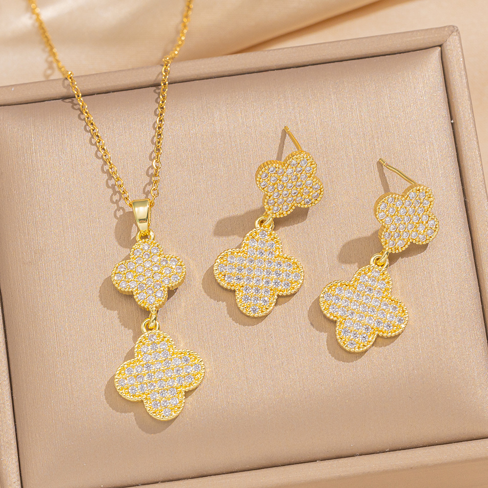 [suit] Korean style clavicle fashion stainless steel necklace with four-leaf clover zircon pendant female 18K real gold color retention