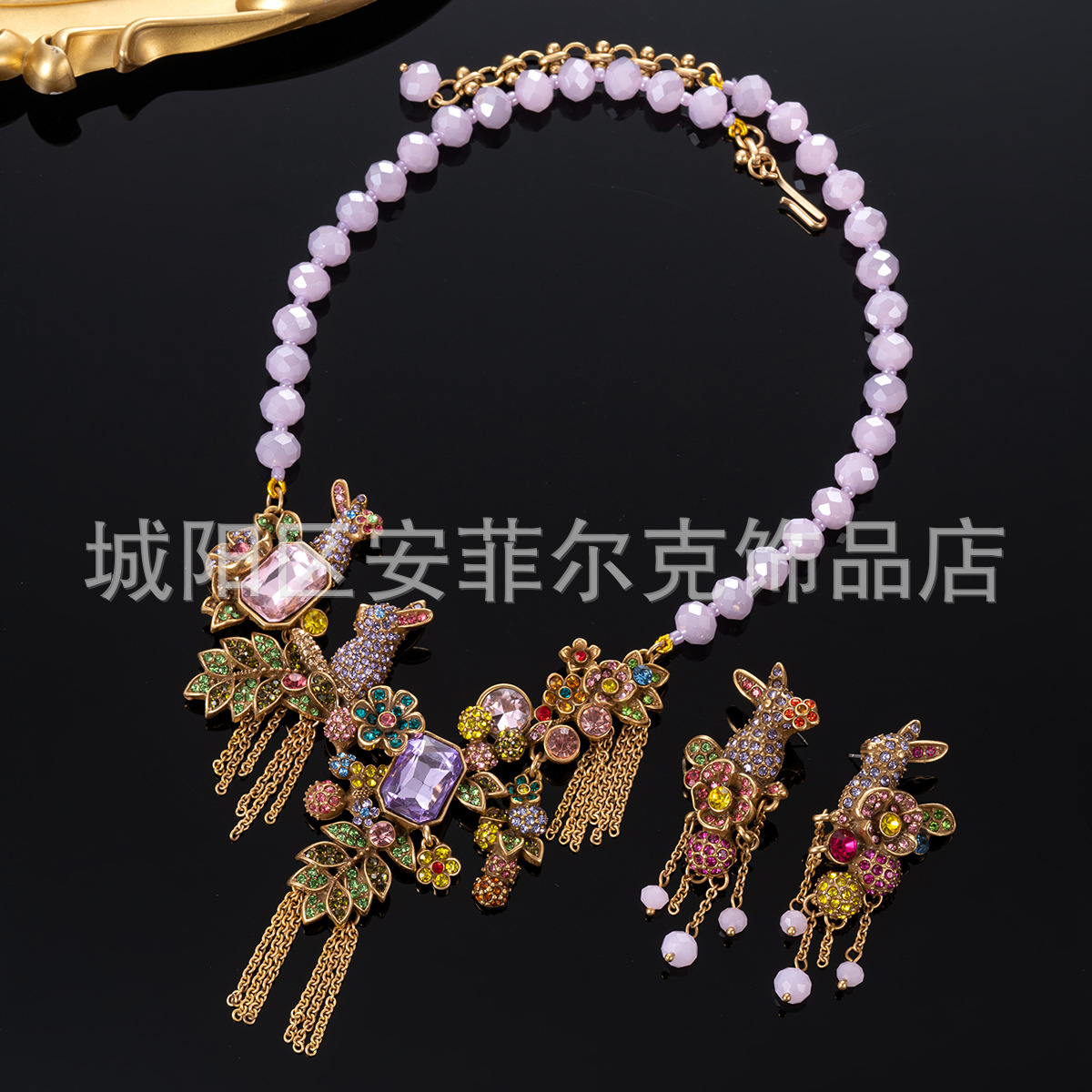 Qingdao Vintage Retro Little Rabbit Fantasia Earring Necklace Set Heavy Luxury Pink Purple Full Diamond Rabbit Necklace