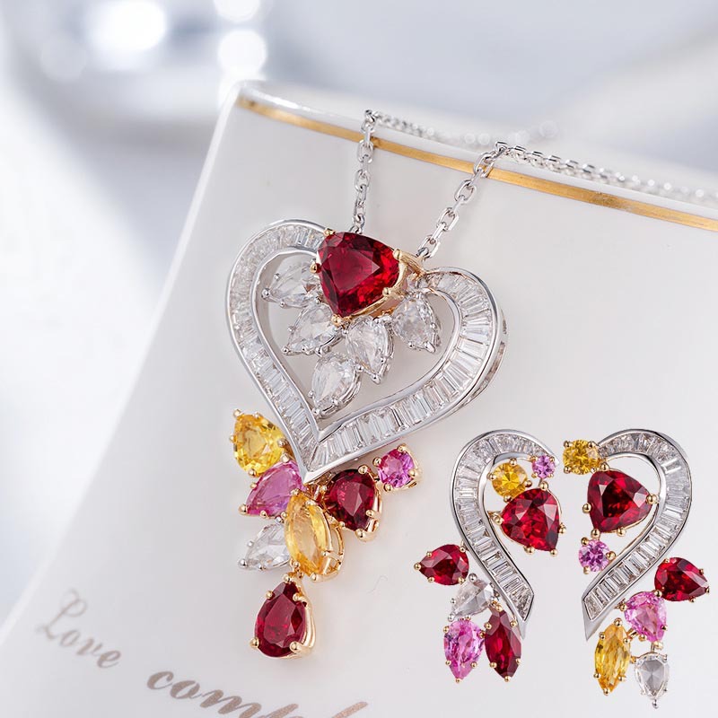 Light Luxury Full Diamond Ruby Heart Pendant T Square Diamond Earrings High Fixed Design Jewelry Super Fairy Color Treasure Necklace Set