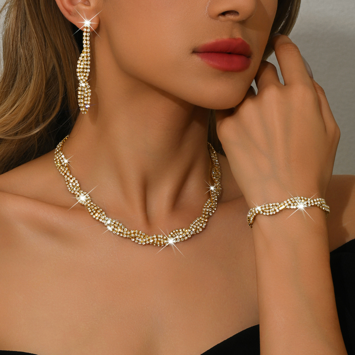 Cross-Border Hot-Selling Claw Chain Rhinestone Twist Necklace Earrings Bracelet Set Fashionable and Unique European and American Style Clavicle Chain Wholesale