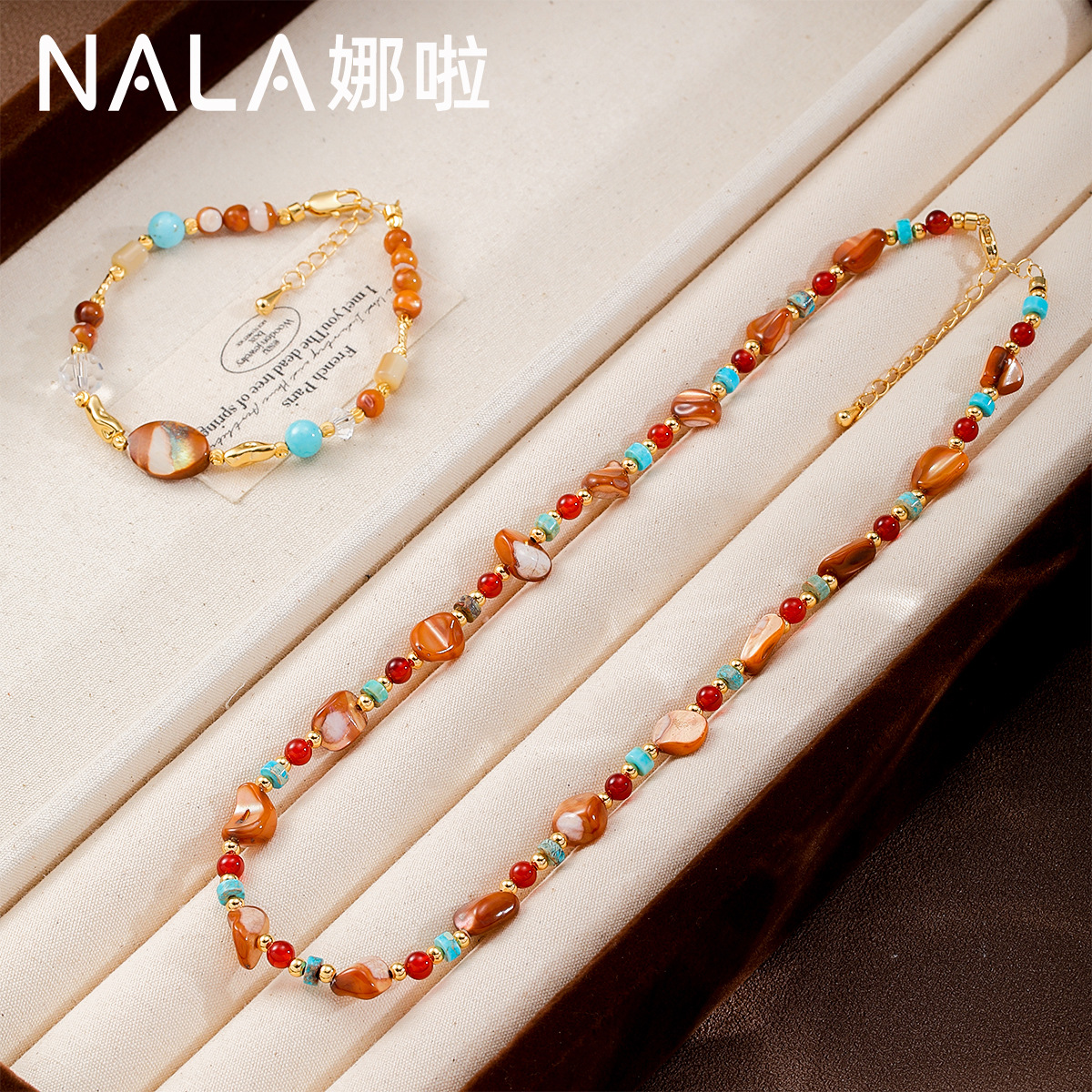 Medieval Jewelry Brown Special-Shaped Shell Orchid Turquoise Red Beads Necklace Bracelet Set Niche Jewelry Set