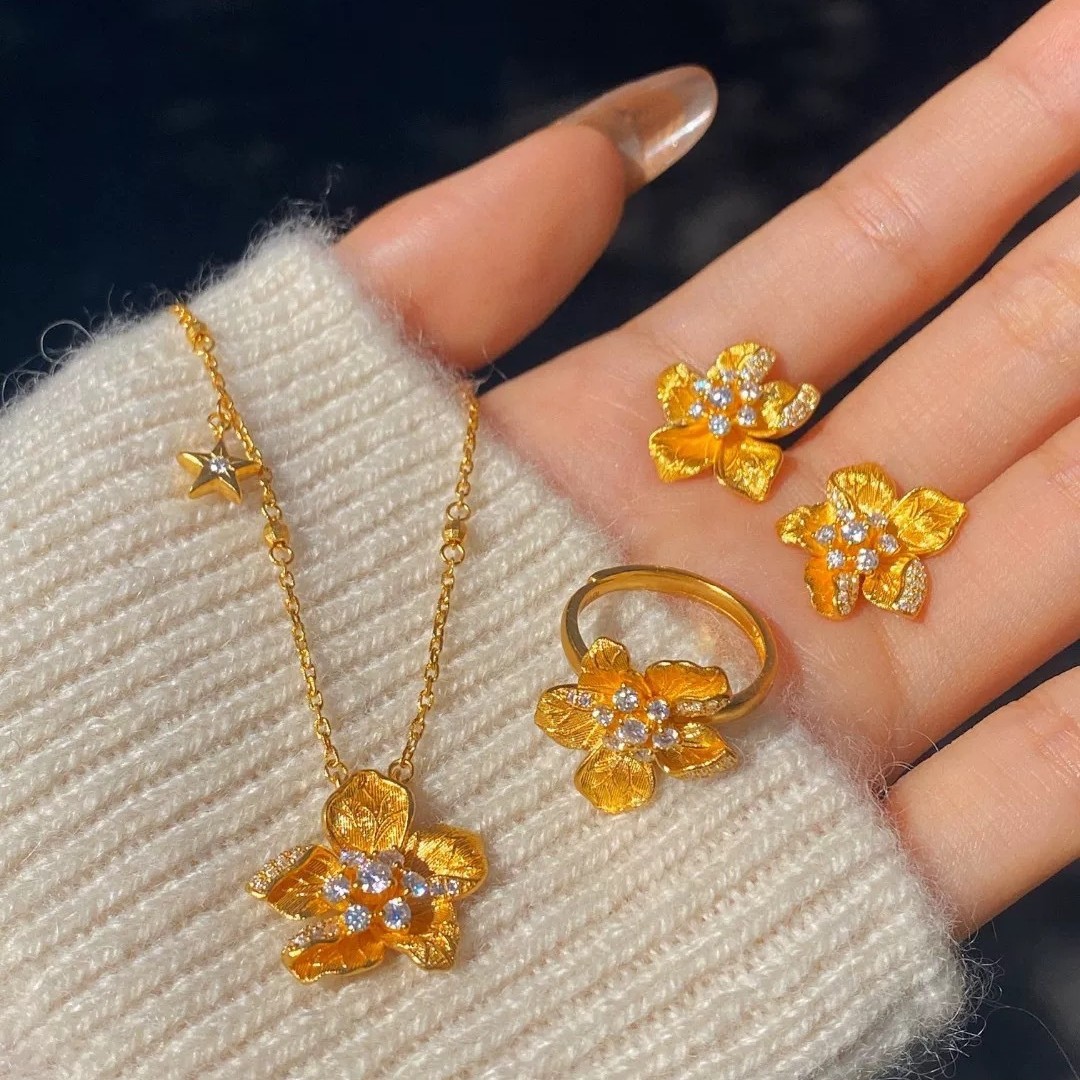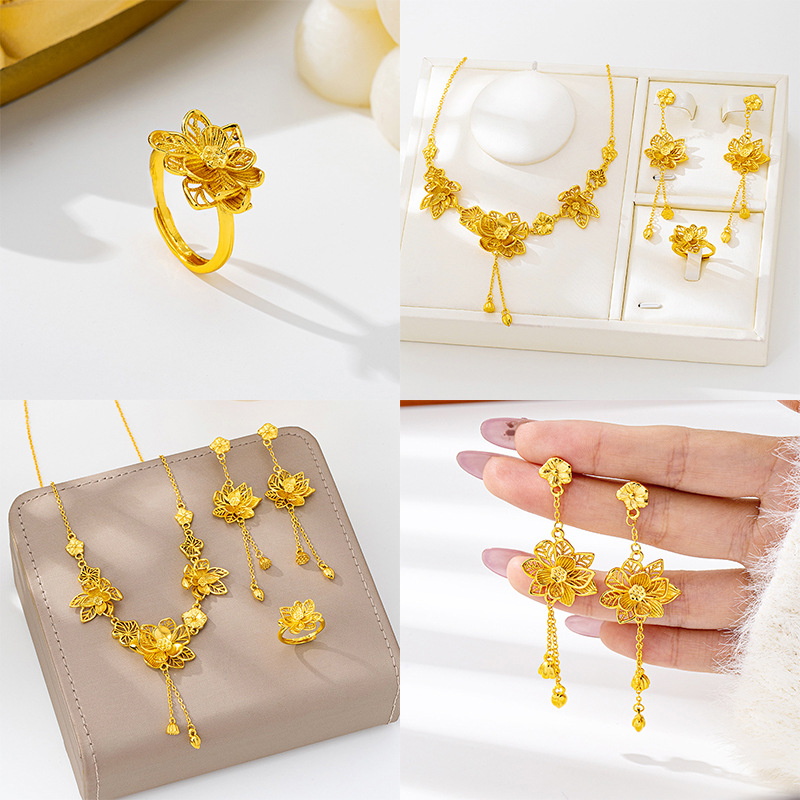 Vietnamese Sand Gold High Color Retention Embossed Noble Gold Flower Ring Earrings Necklace Set Elegant Gift for Girlfriend Summer Essential